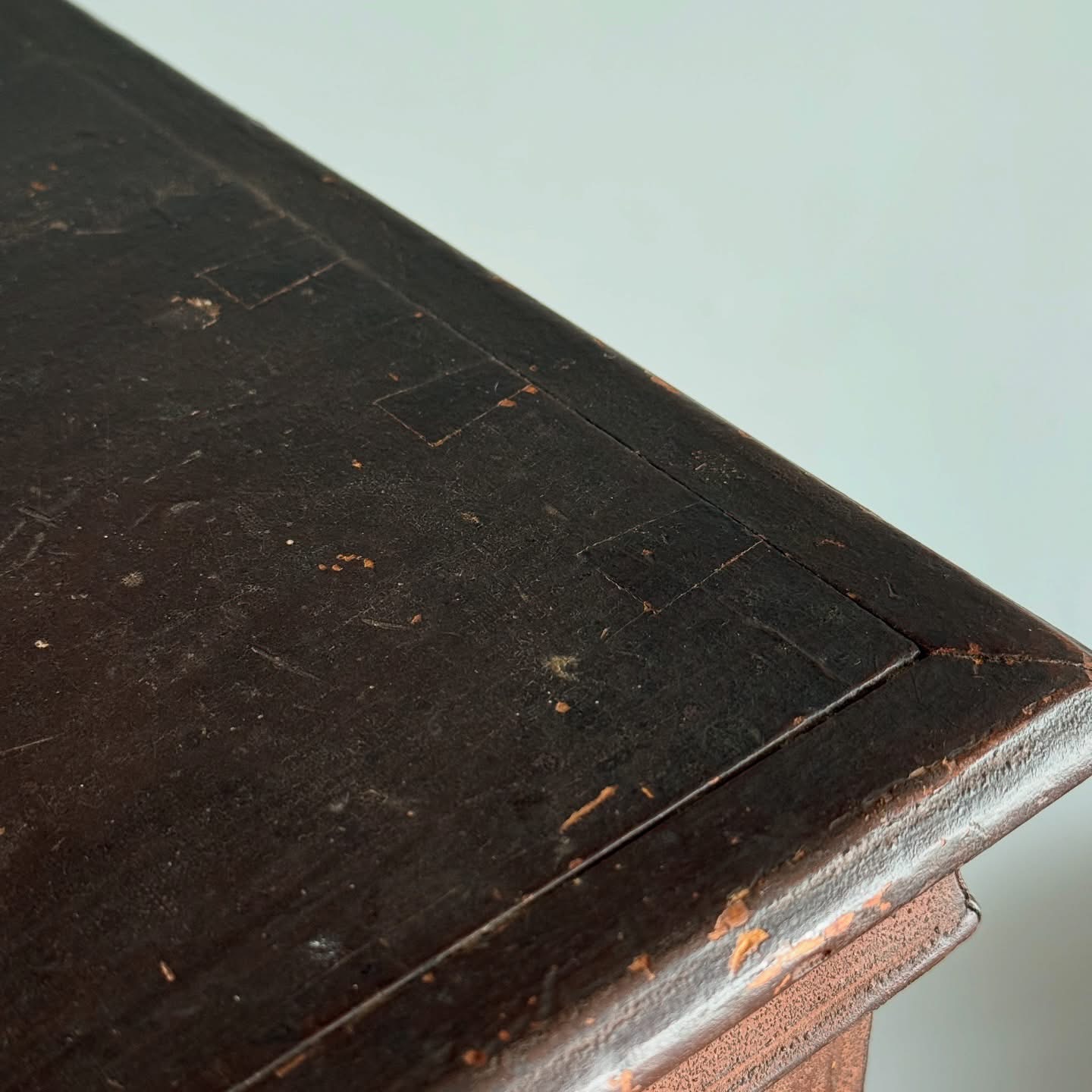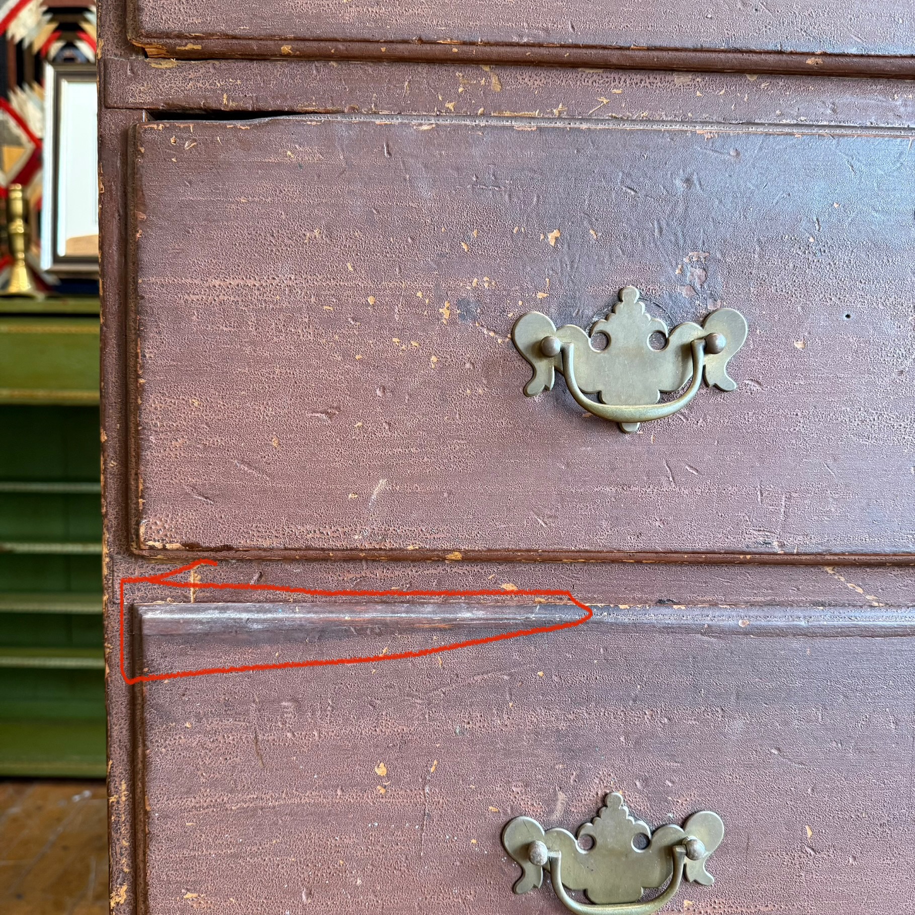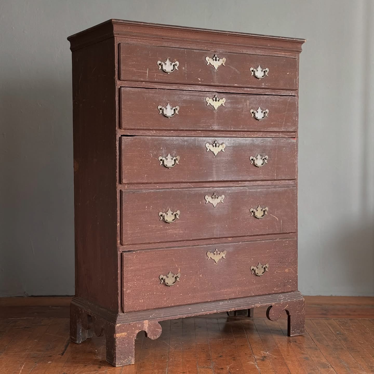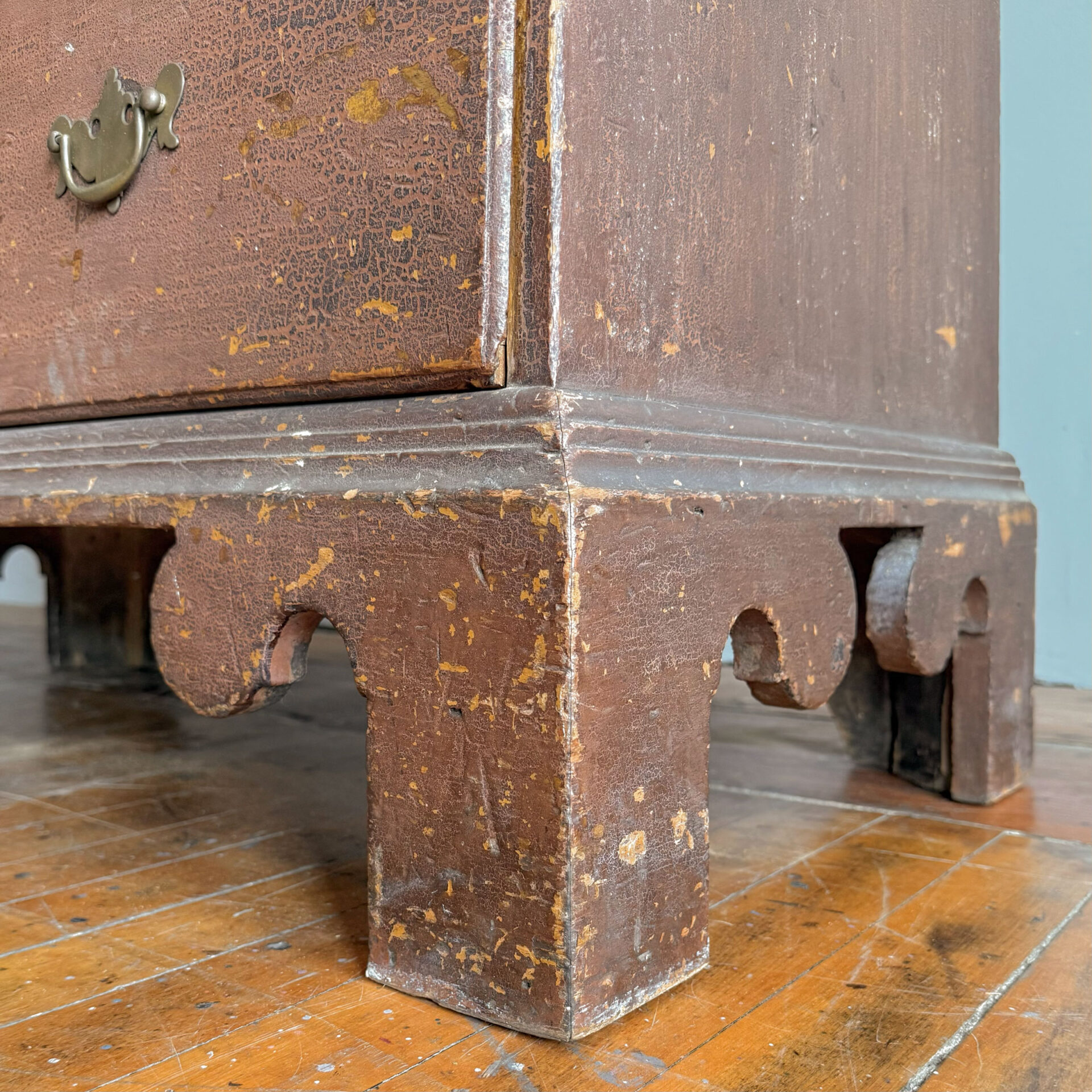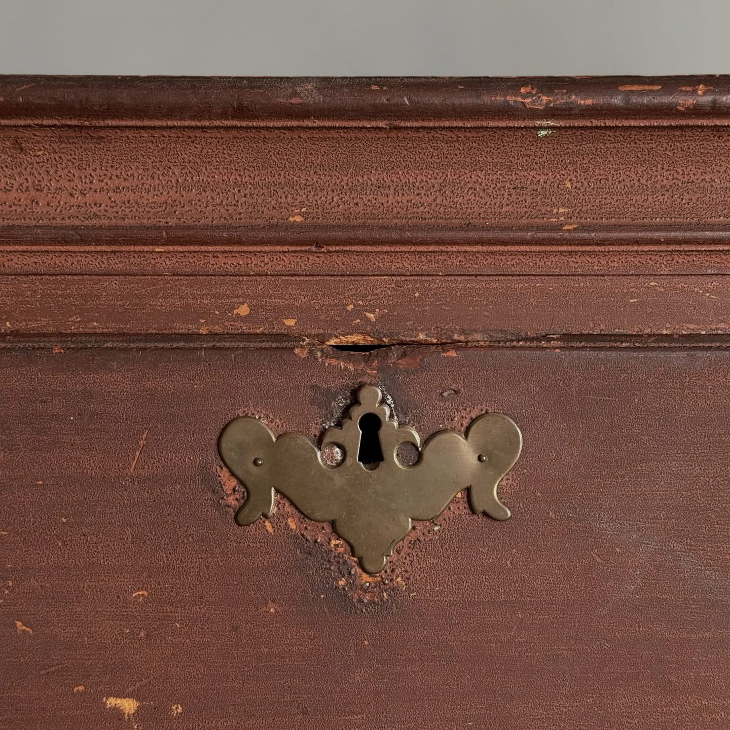 The survival of the original finish is perhaps most remarkable—so many pieces from this period have been entirely refinished over the past century. And while they remain interesting forms… well. Somehow this chest escaped the trend and retains a completely intact, now-granulated shellac over the original light red-brown painted surface.
