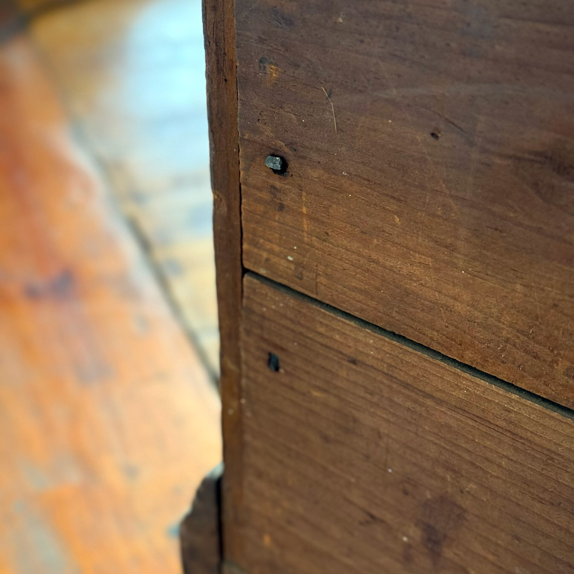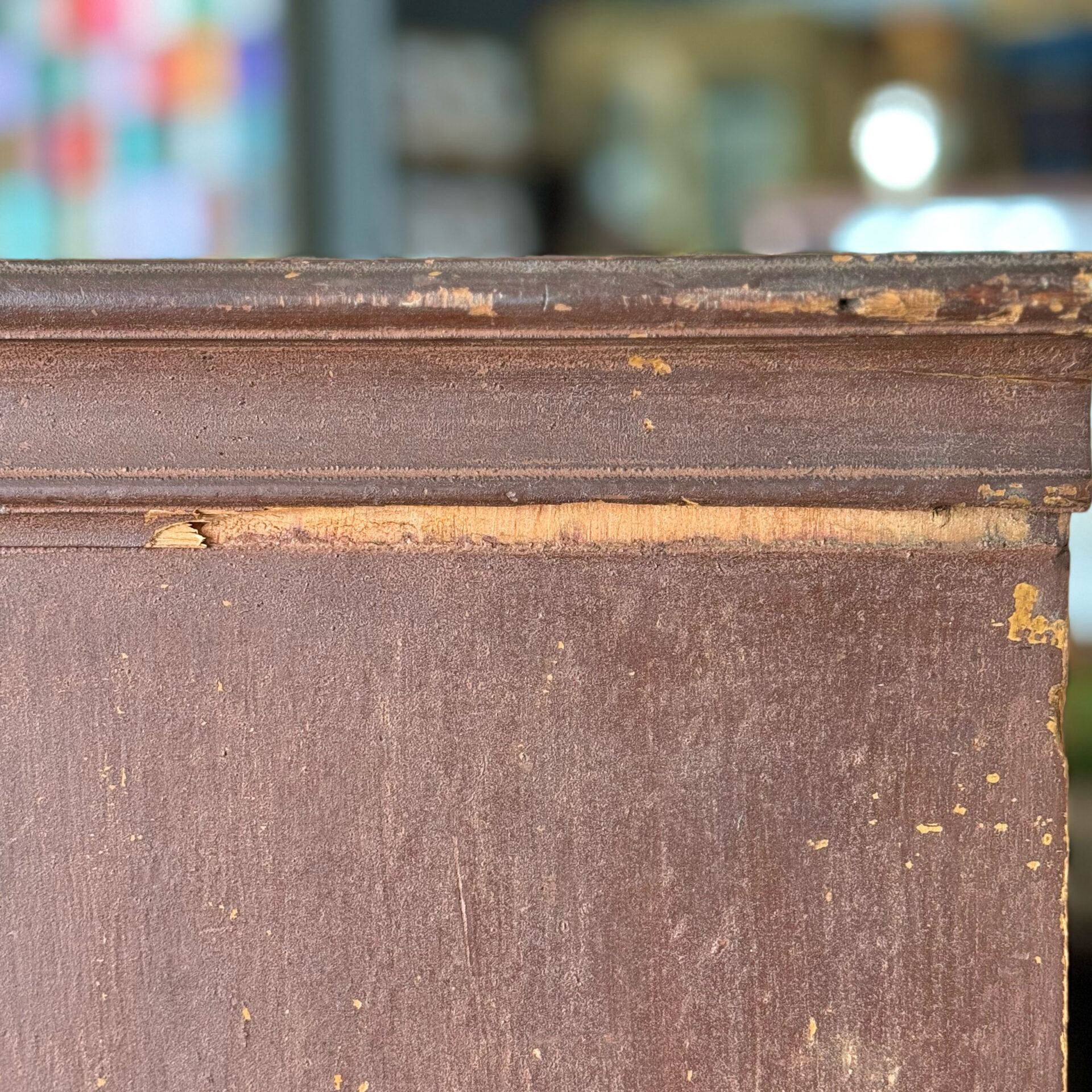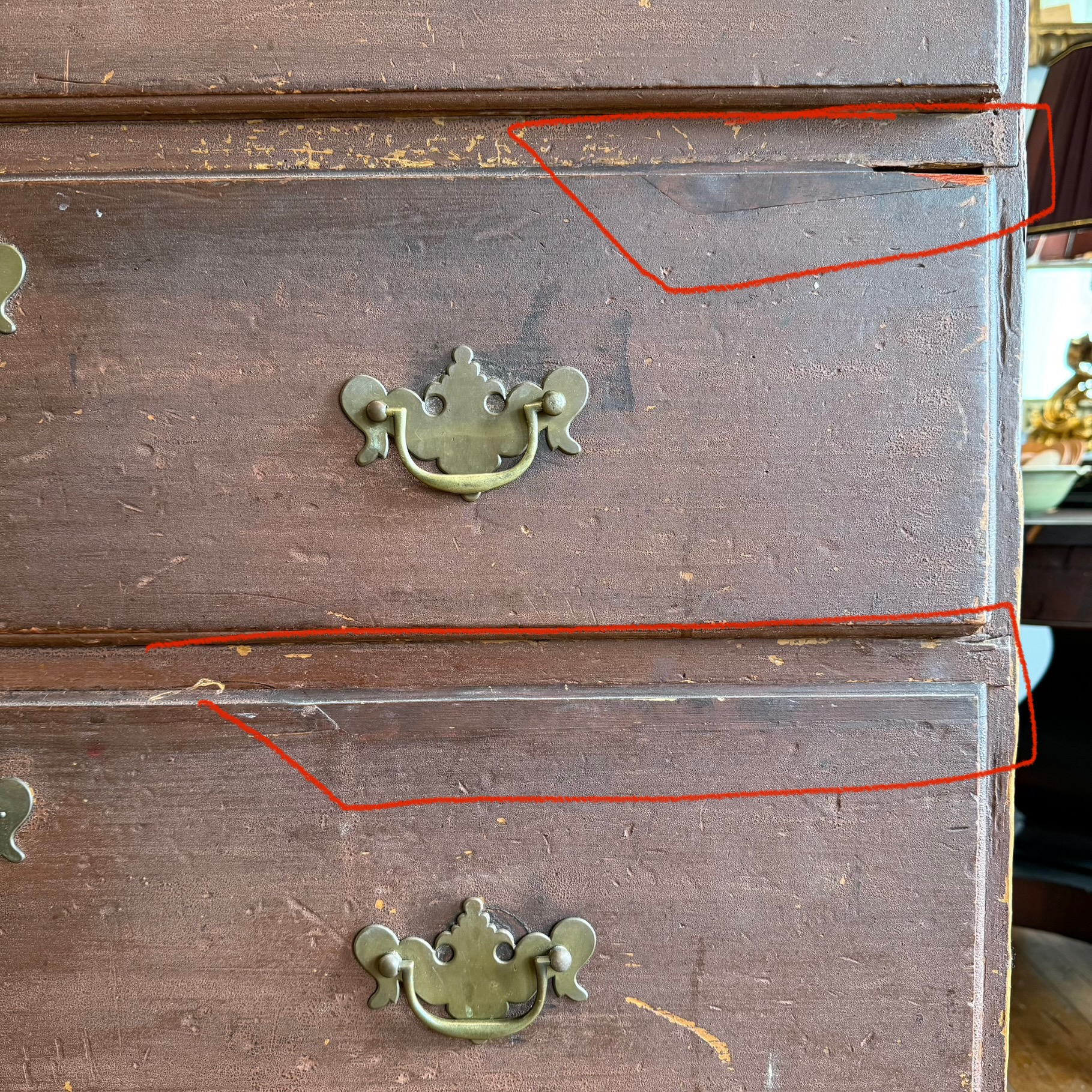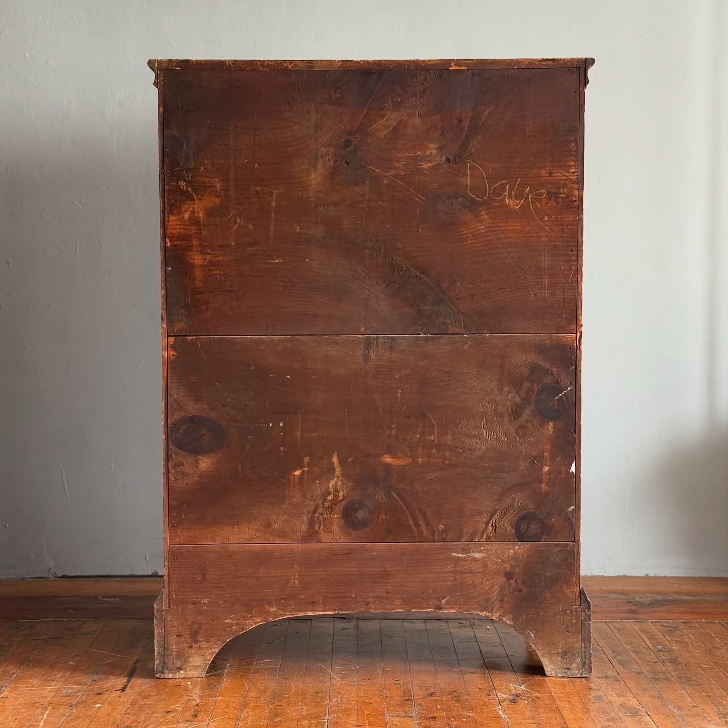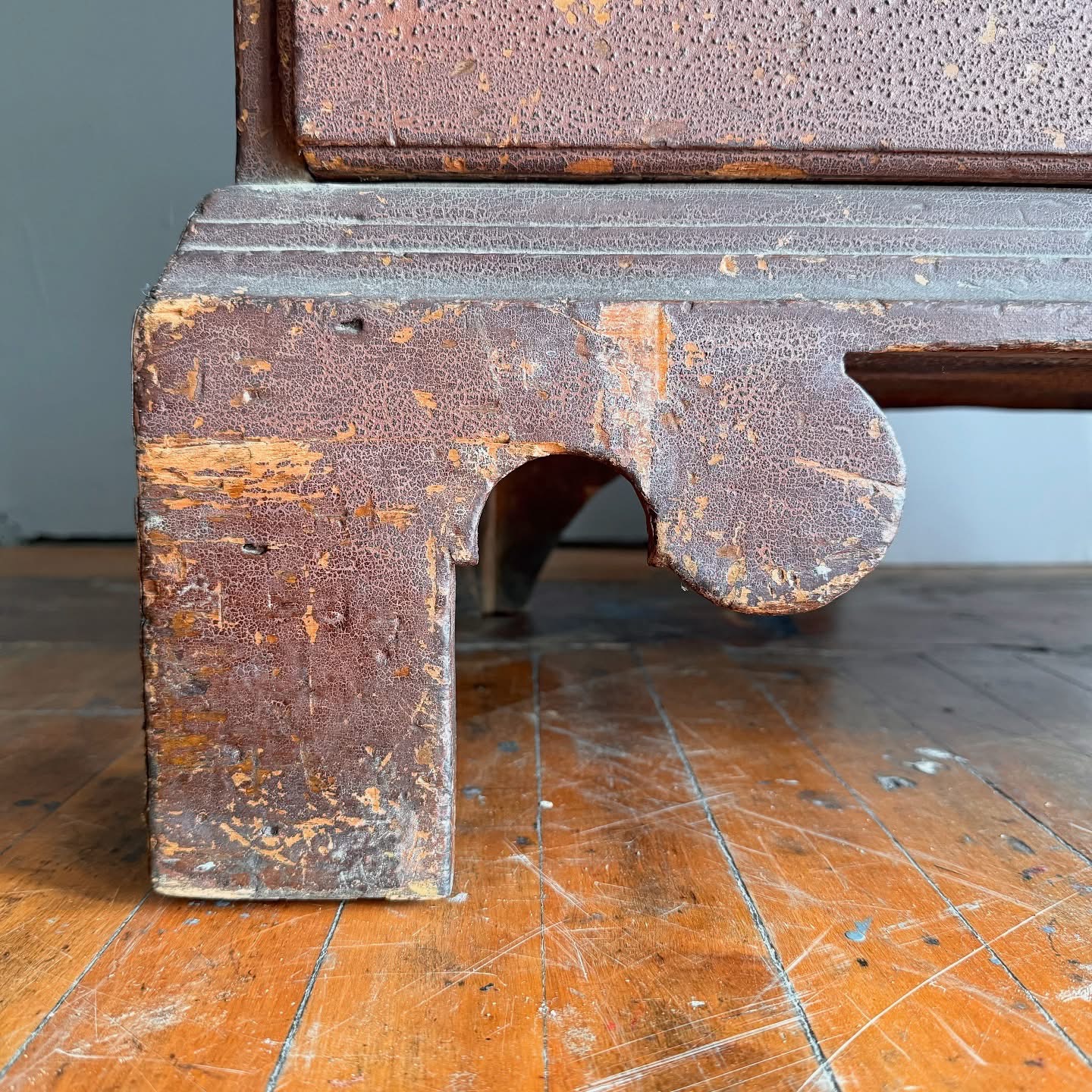 The survival of the original finish is perhaps most remarkable—so many pieces from this period have been entirely refinished over the past century. And while they remain interesting forms… well. Somehow this chest escaped the trend and retains a completely intact, now-granulated shellac over the original light red-brown painted surface.