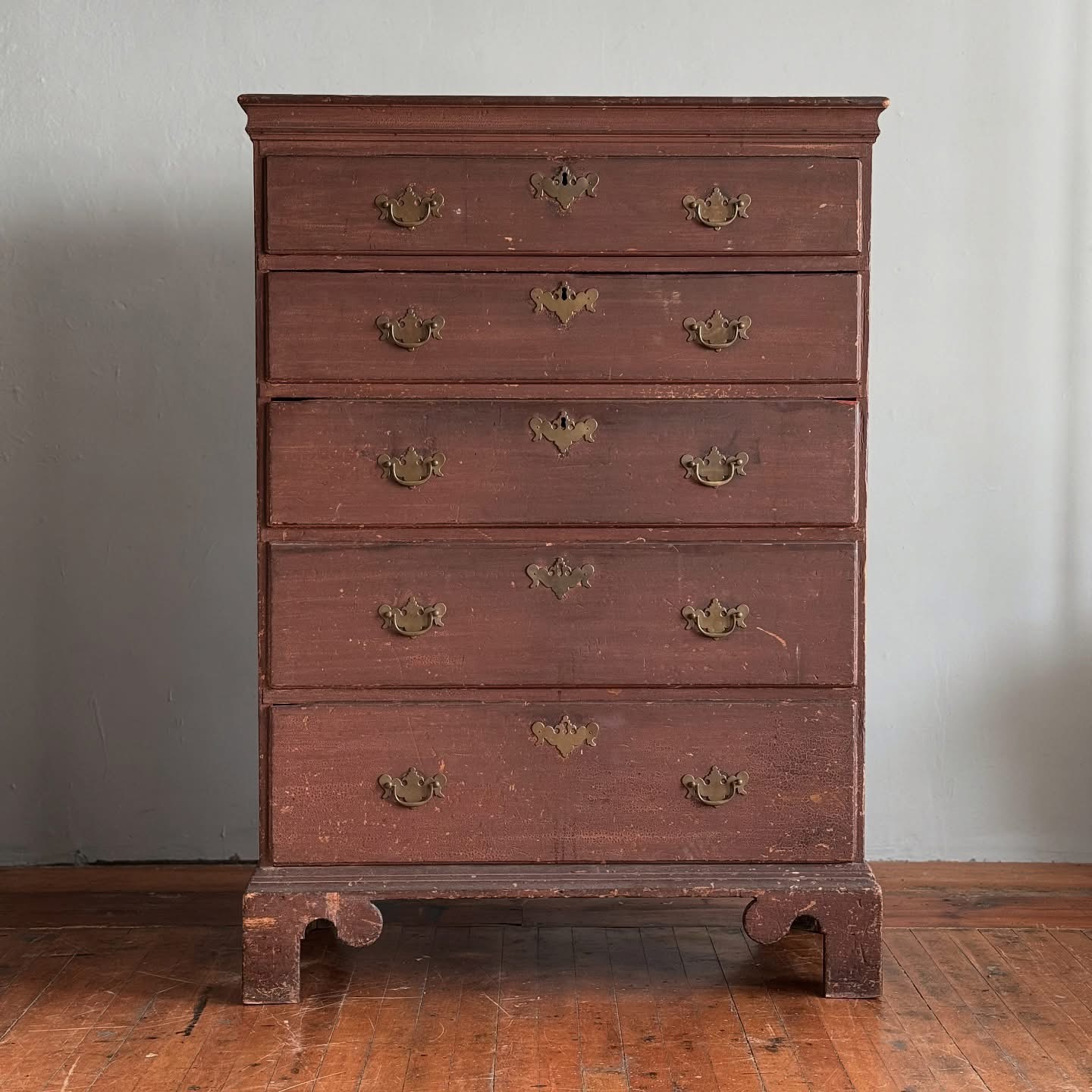 American Chippendale tall chest with five graduated drawers, cornice molding, and distinctively shaped bracket feet (dig the tombstone and lollipop!). Circa 1780s–1790s and purportedly from eastern Massachusetts.