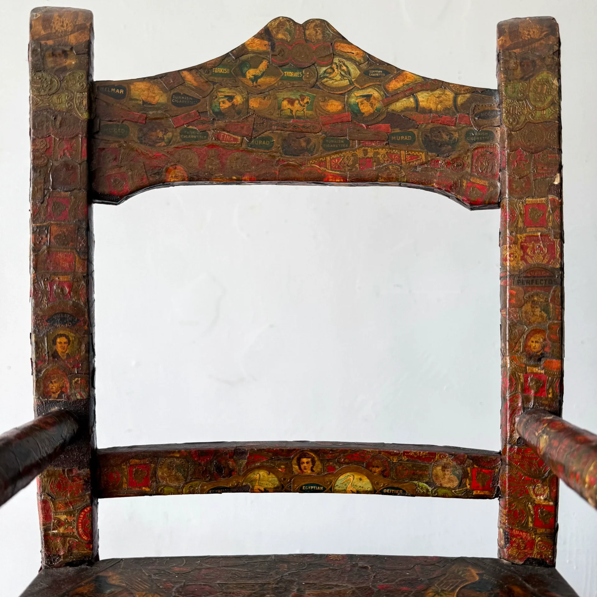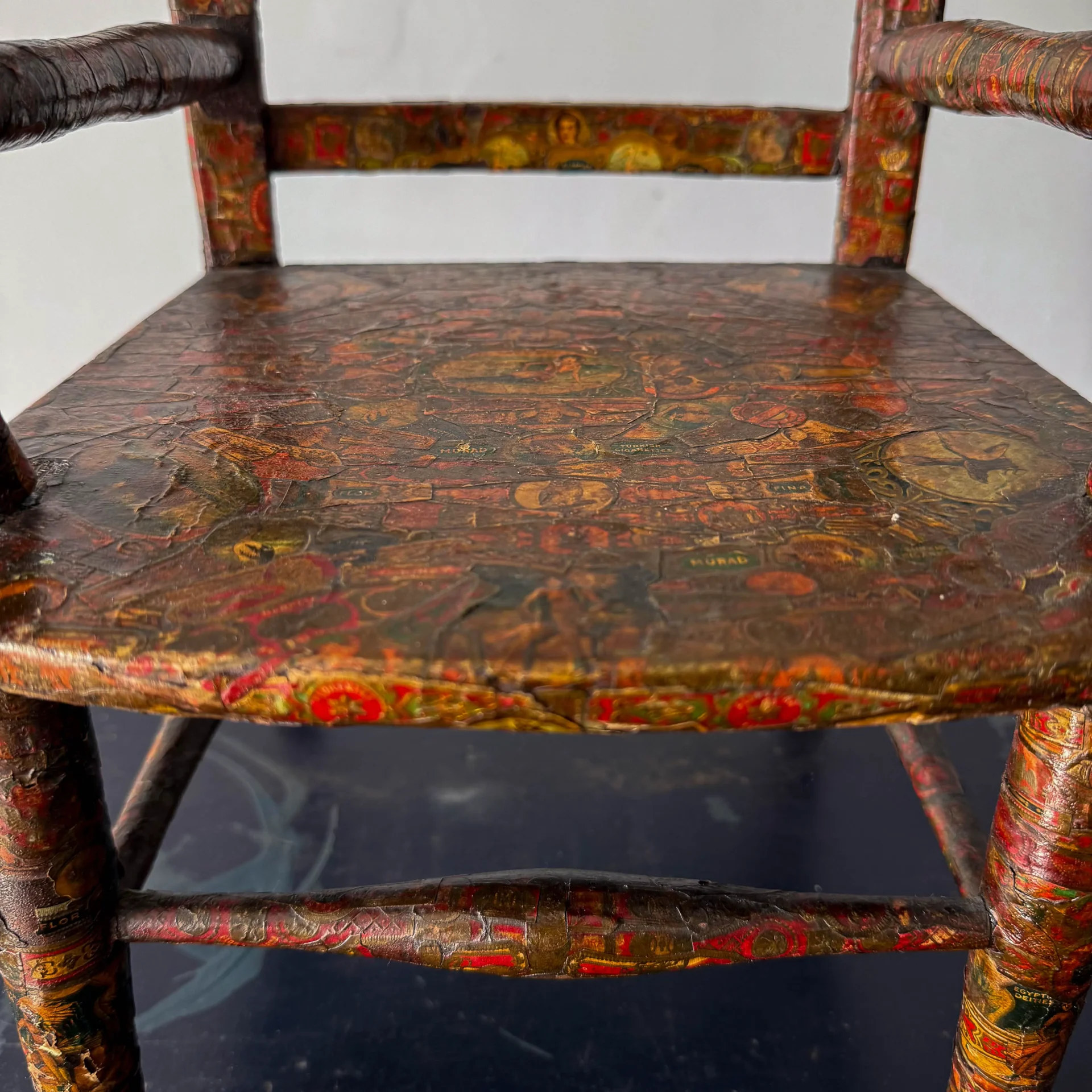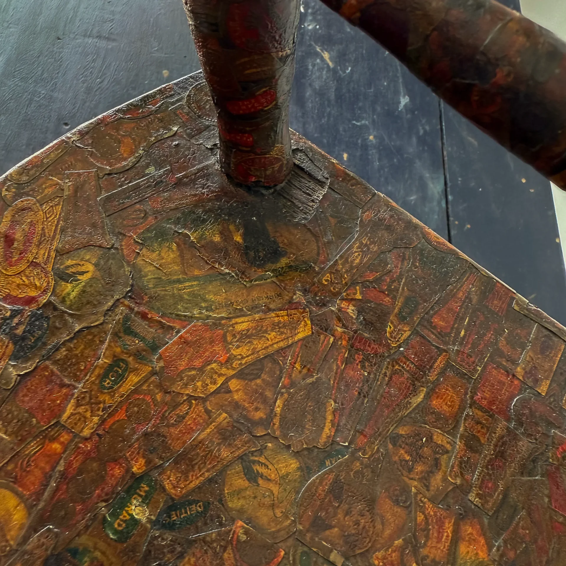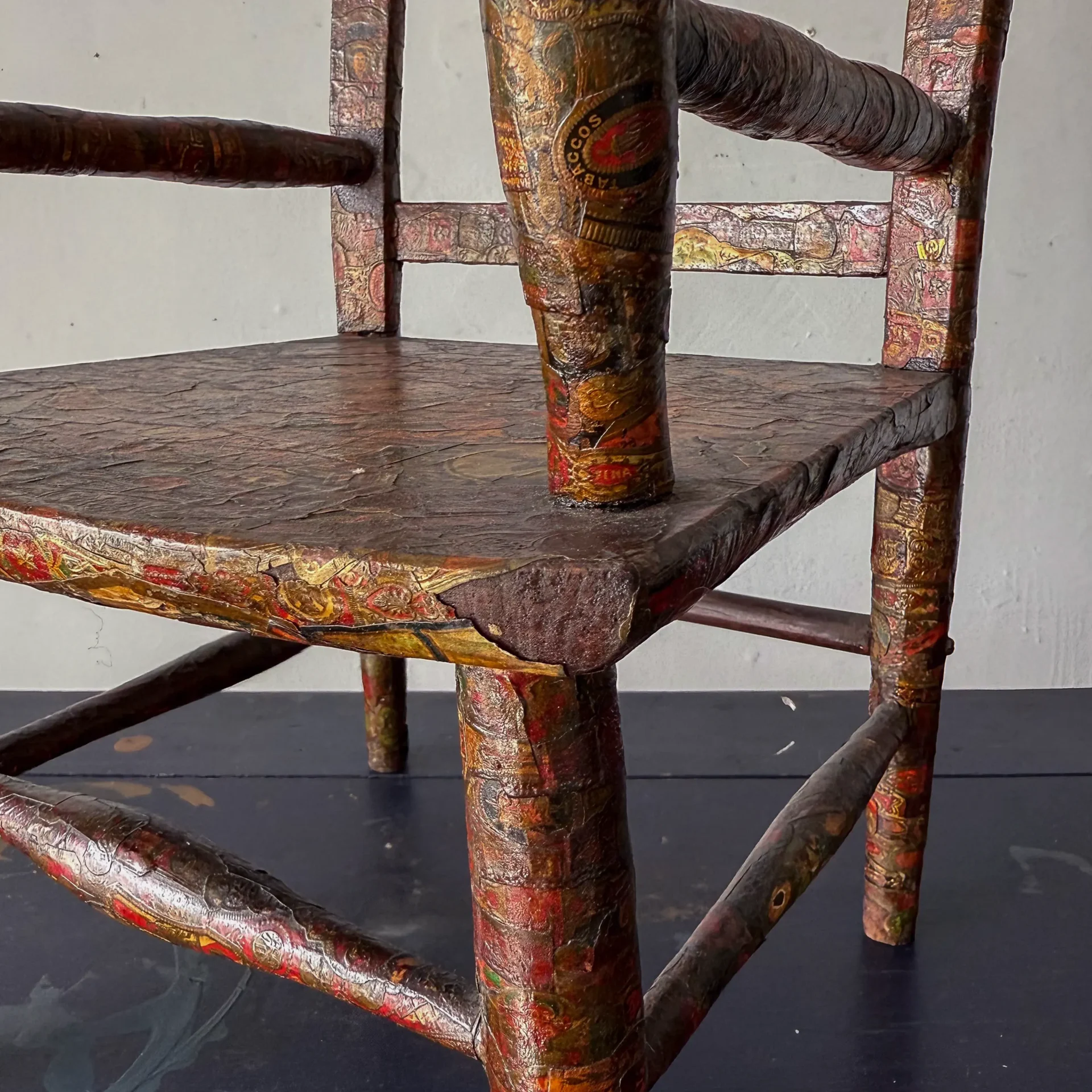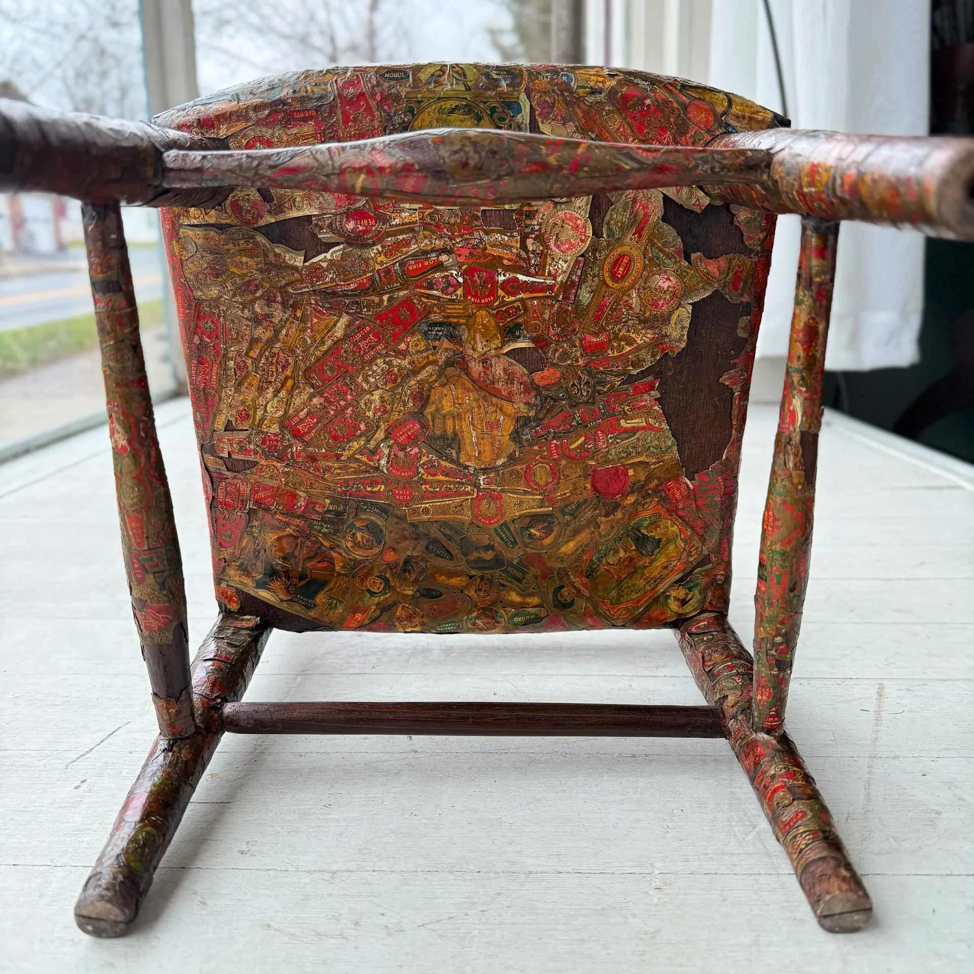 An unusual, circa 1930s child’s chair, entirely cloaked in cigar-band decoupage. Having an overall amber hue developed through decades of mellowing, its maker worked with a surprisingly disciplined hand: the decoration is largely symmetrical, built from early cigar bands and a few thoughtfully placed outliers to keep the eye moving. Every surface is addressed—legs, stretchers, back rails—and even the underside of the seat is fully collaged, suggesting a level of devotion well beyond the casual hobbyist.