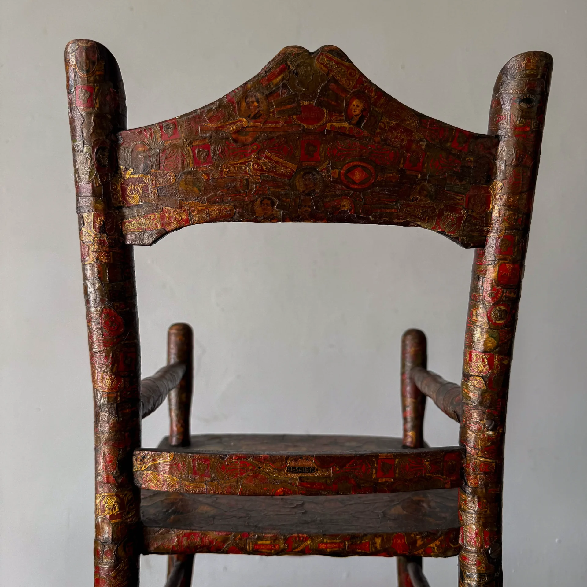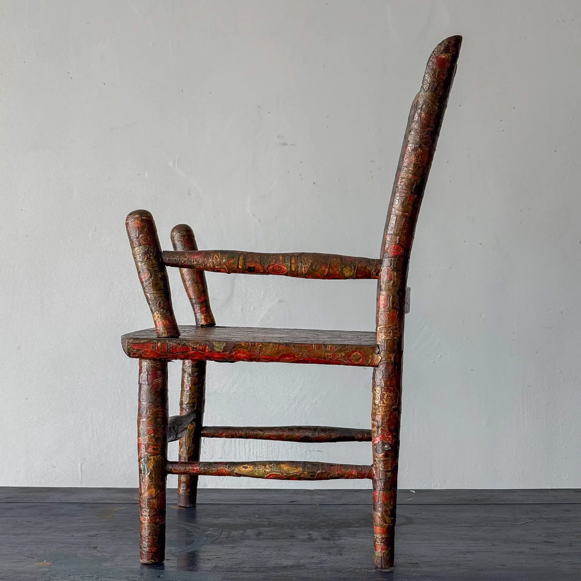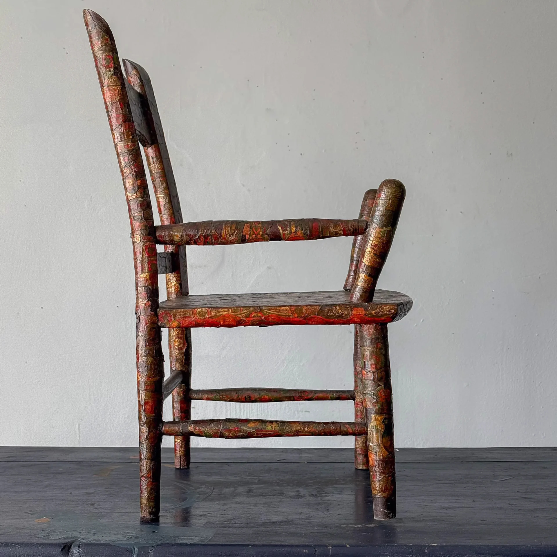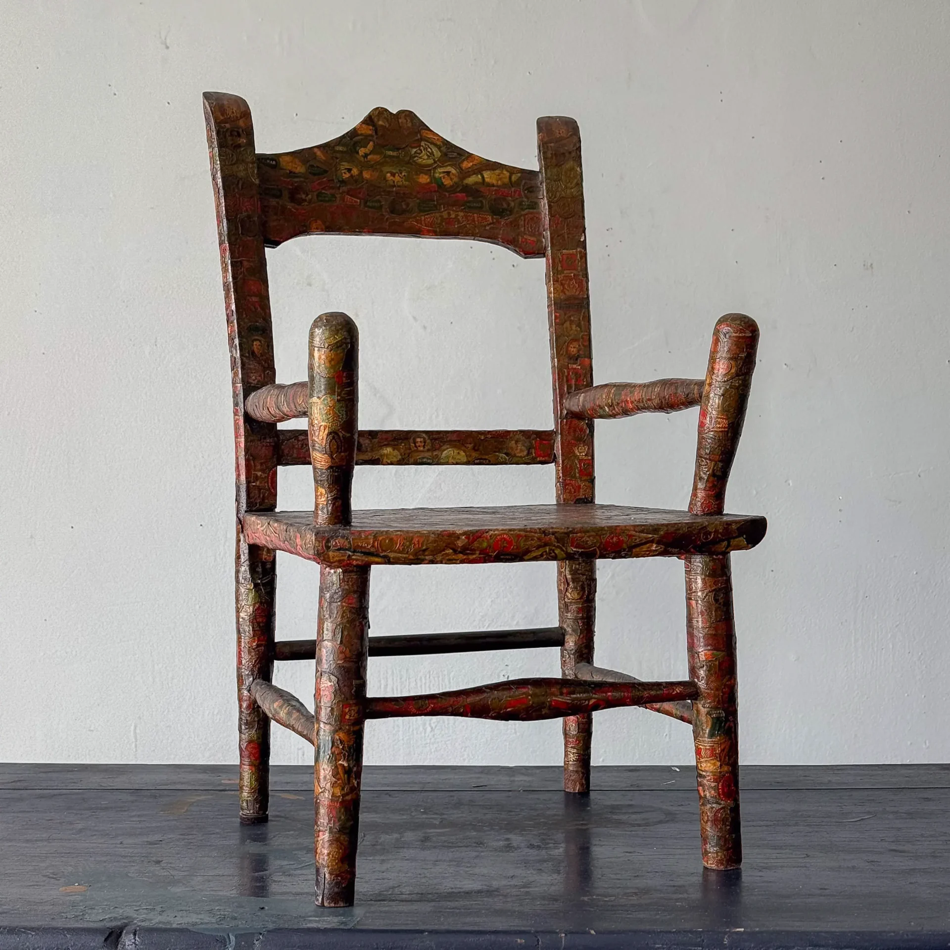 An unusual, circa 1930s child’s chair, entirely cloaked in cigar-band decoupage. Having an overall amber hue developed through decades of mellowing, its maker worked with a surprisingly disciplined hand: the decoration is largely symmetrical, built from early cigar bands and a few thoughtfully placed outliers to keep the eye moving. Every surface is addressed—legs, stretchers, back rails—and even the underside of the seat is fully collaged, suggesting a level of devotion well beyond the casual hobbyist.