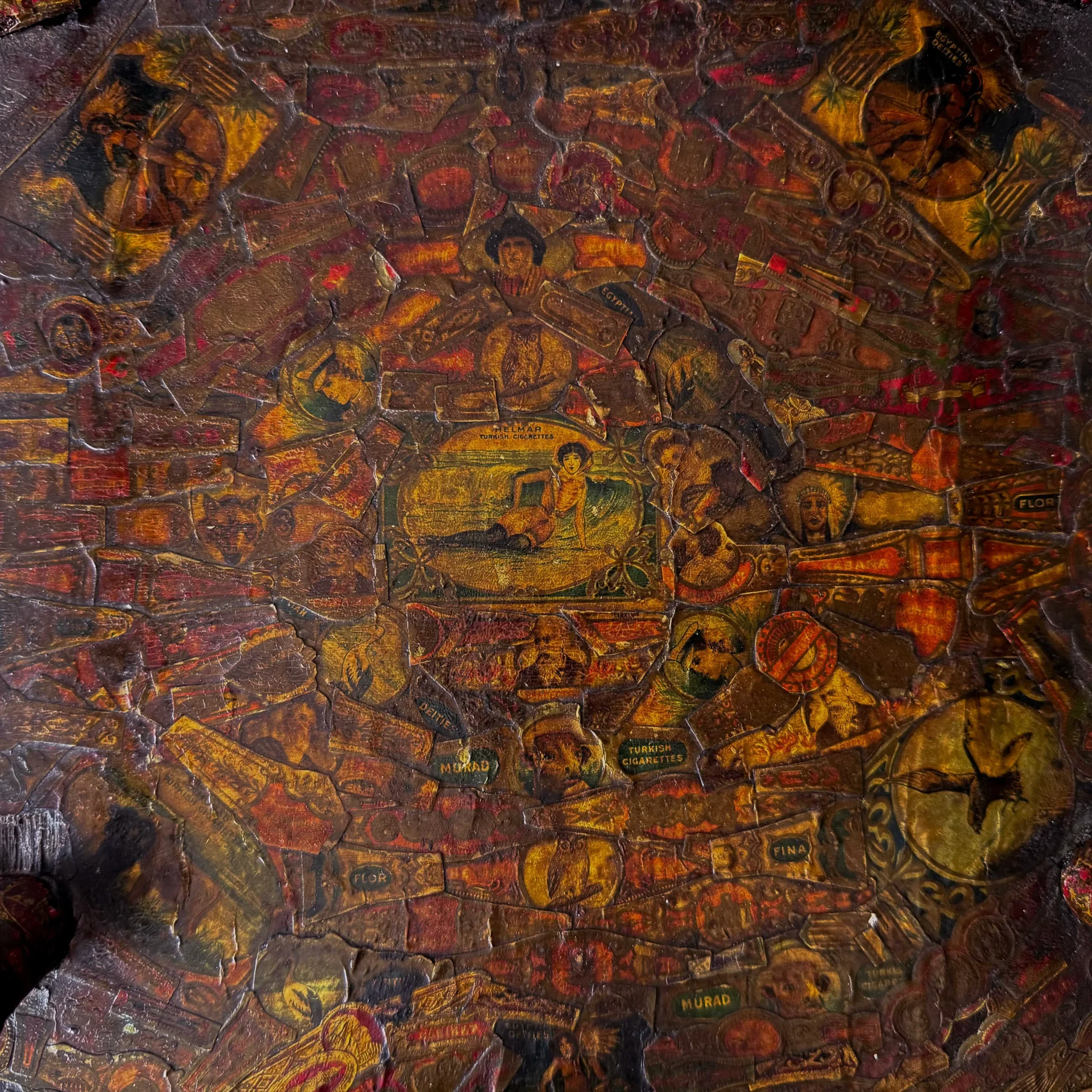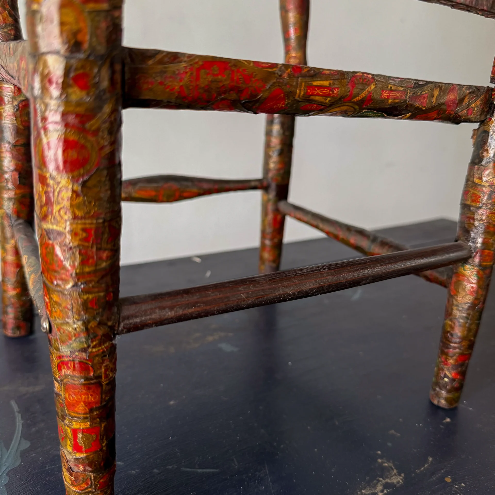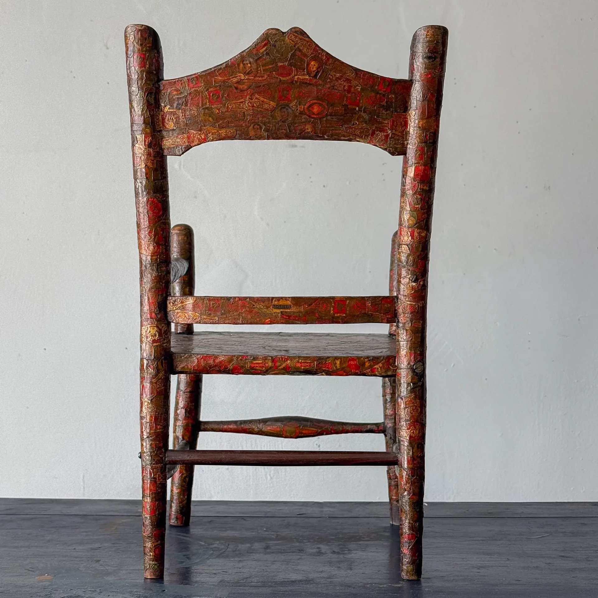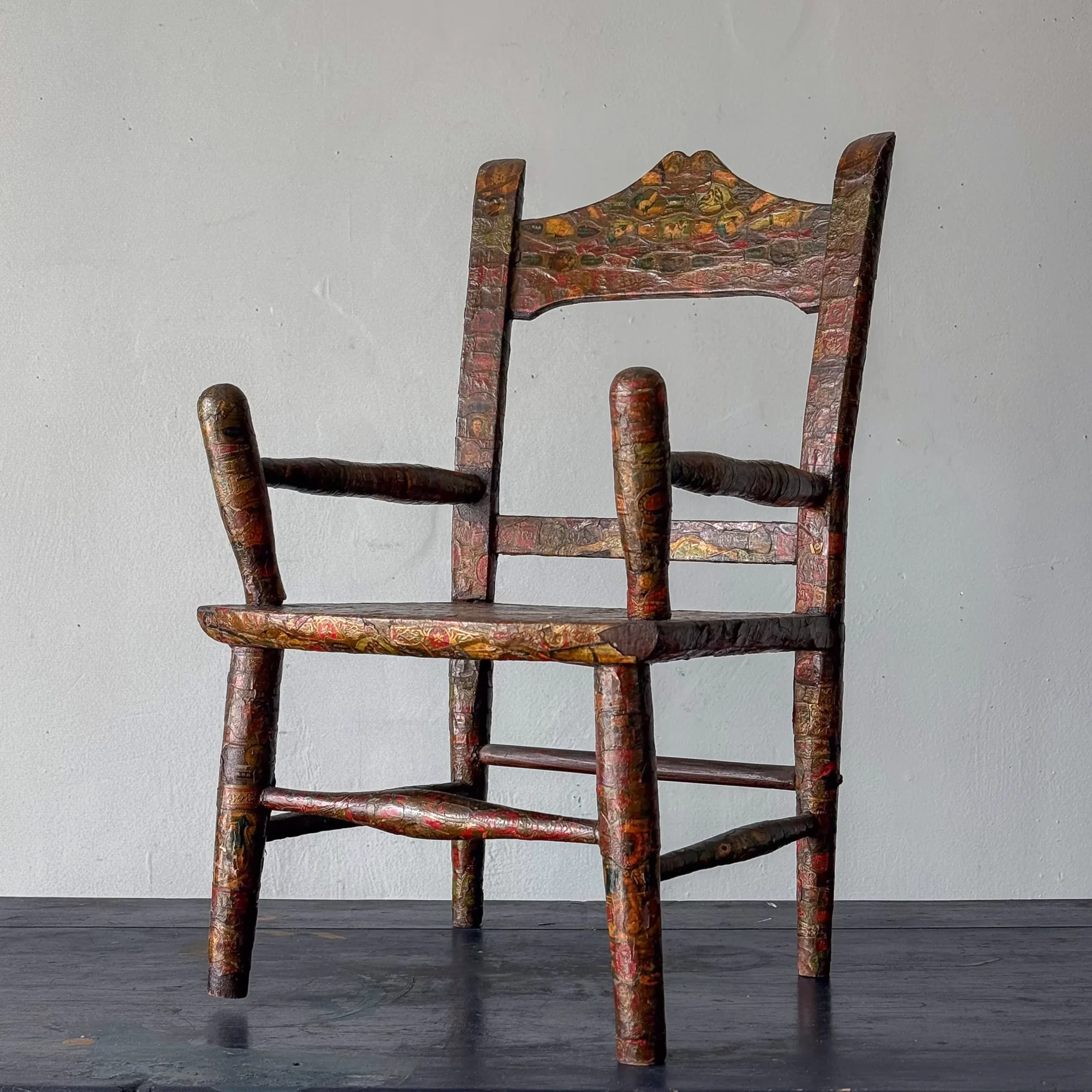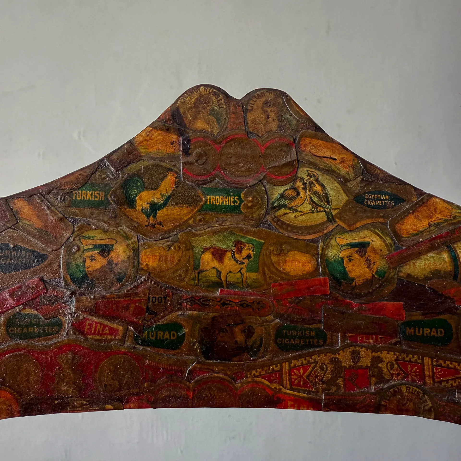 An unusual, circa 1930s child’s chair, entirely cloaked in cigar-band decoupage. Having an overall amber hue developed through decades of mellowing, its maker worked with a surprisingly disciplined hand: the decoration is largely symmetrical, built from early cigar bands and a few thoughtfully placed outliers to keep the eye moving. Every surface is addressed—legs, stretchers, back rails—and even the underside of the seat is fully collaged, suggesting a level of devotion well beyond the casual hobbyist.