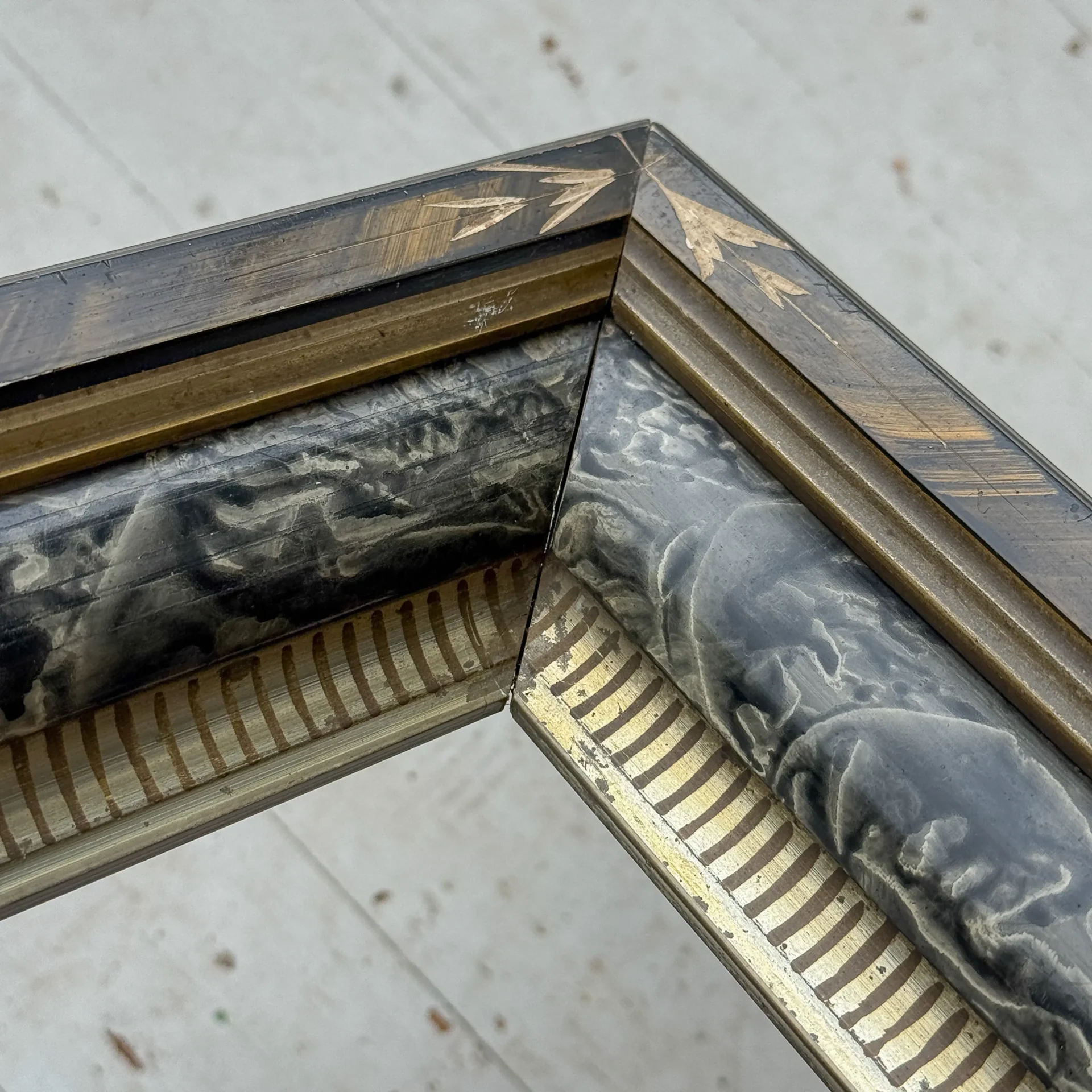 Outermost molding is yellow and black with etched decoration at corners. Middle layer is black/white/gray tortoise shell style. Liner is striped alternating between pale shiny gold and darker matte gold.