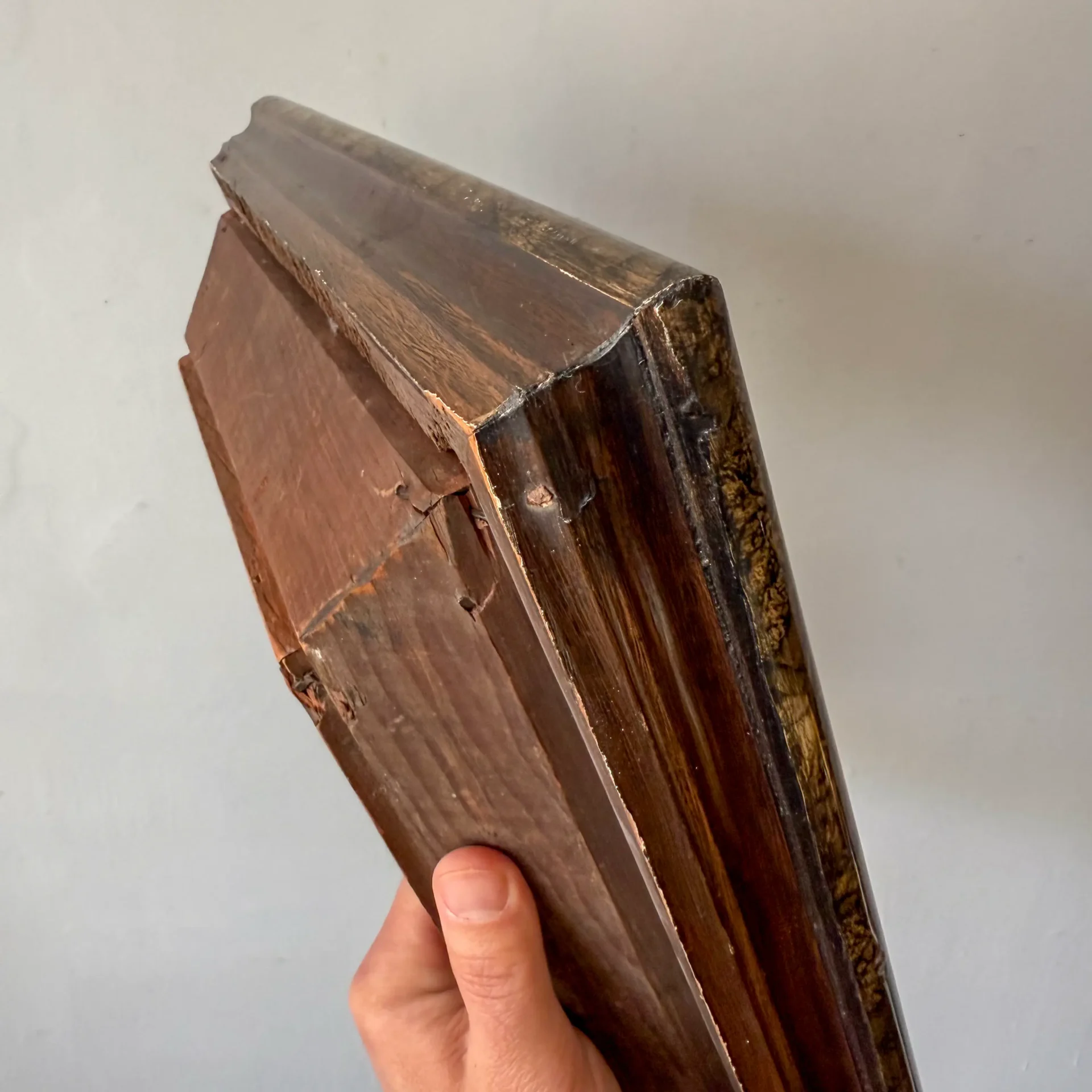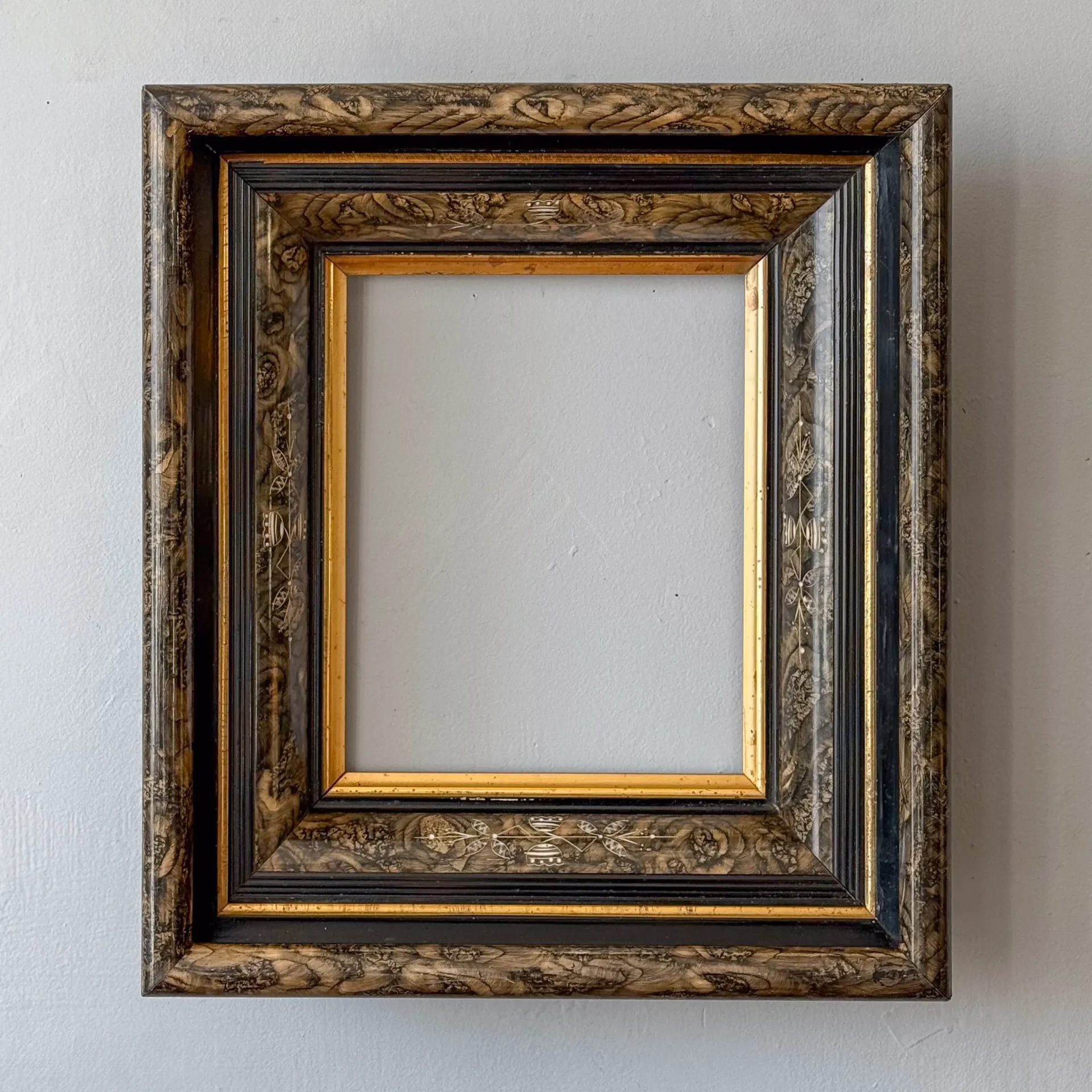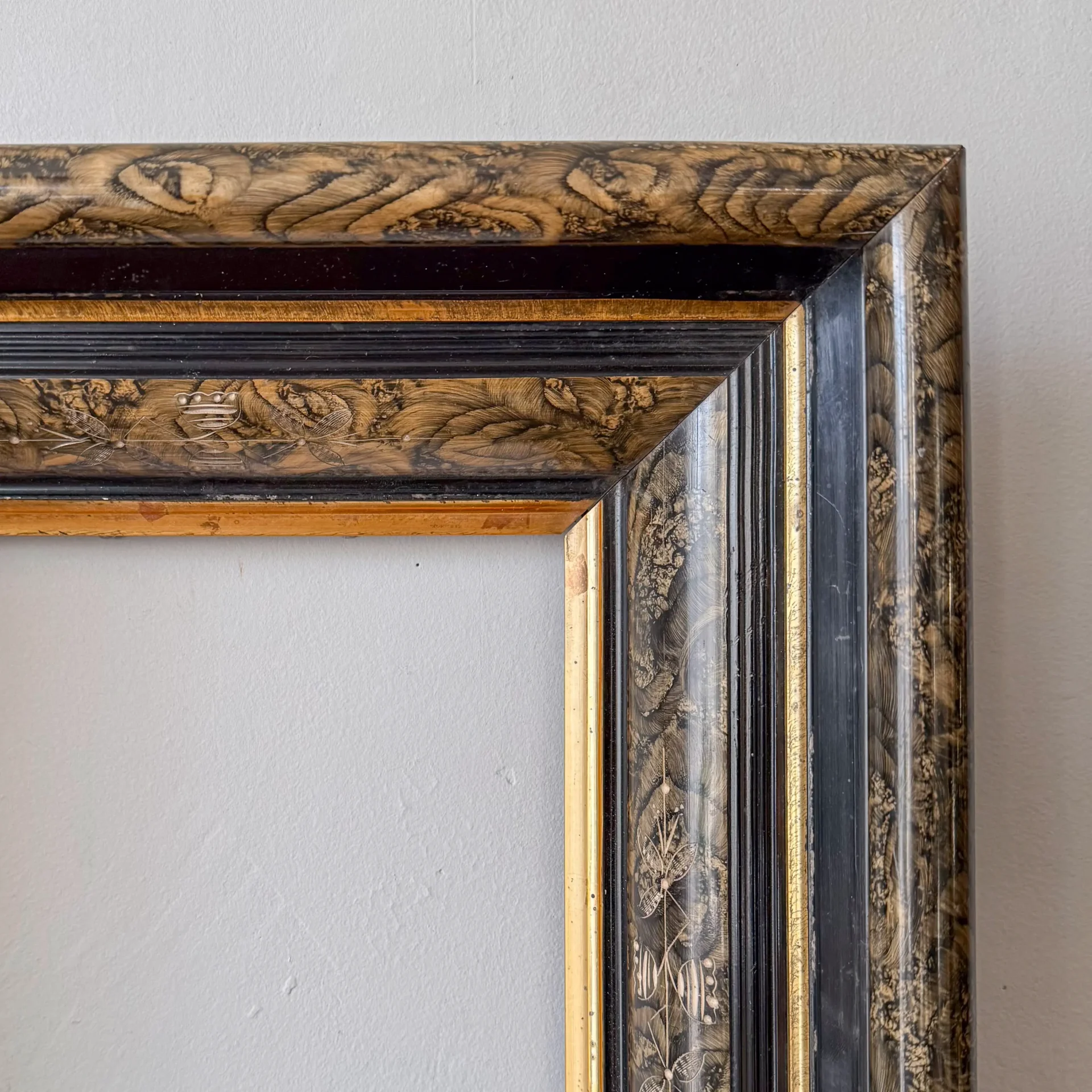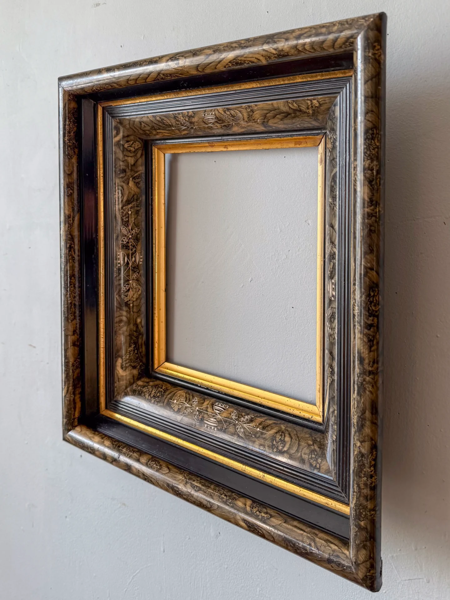 Handsome four-layer Eastlake-style picture frame alternating tortoise-shell-style painting, black lacquer, and gilt liners.