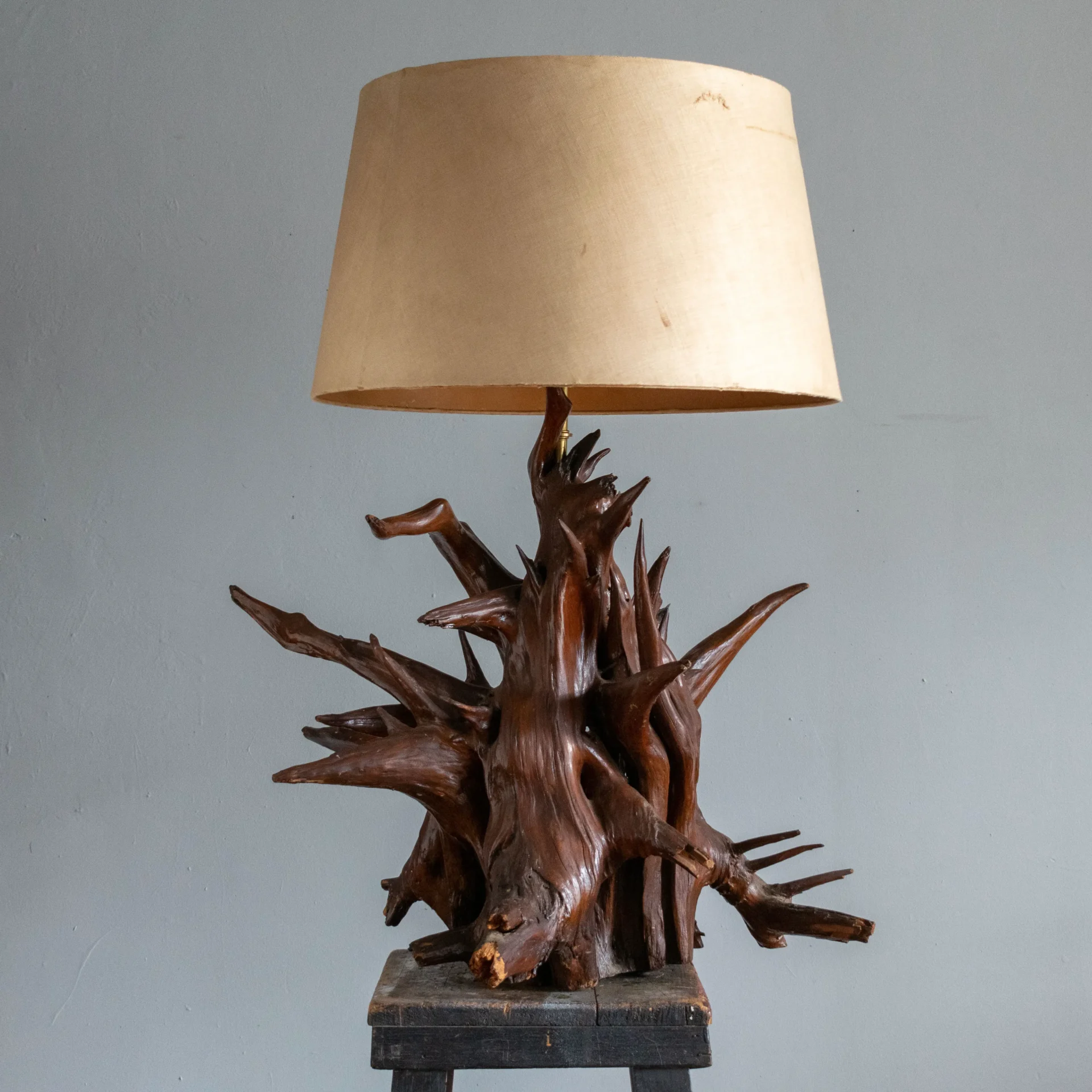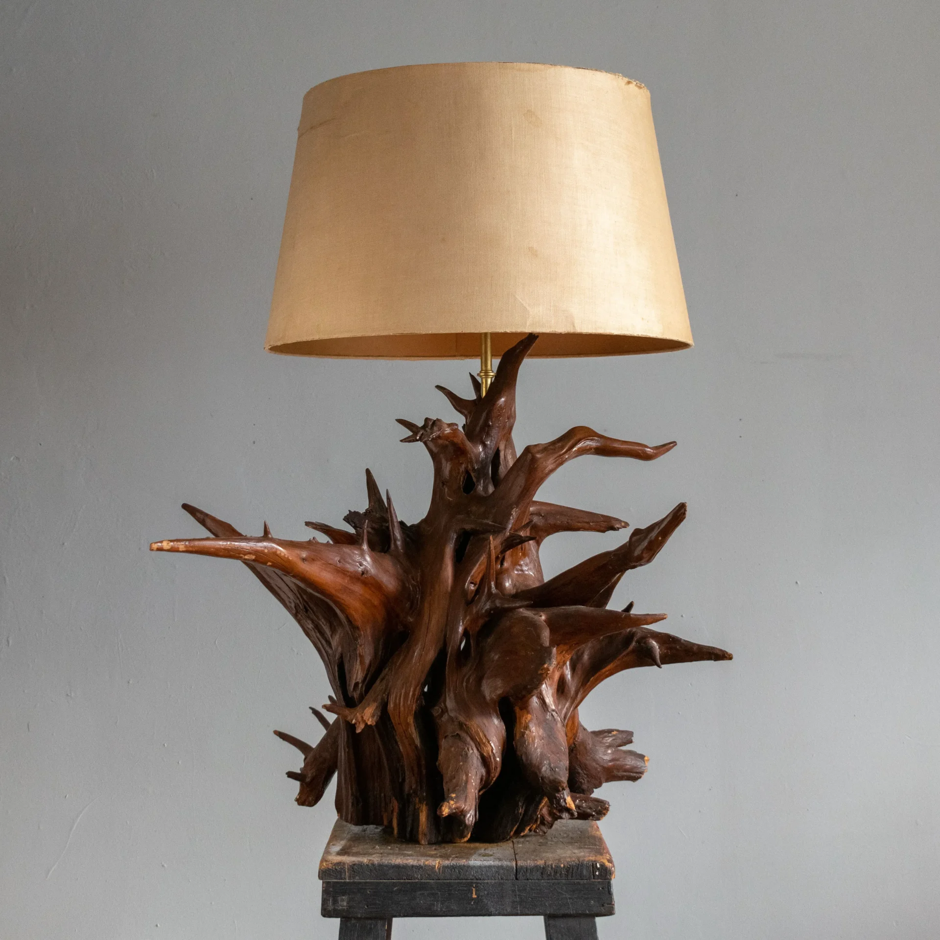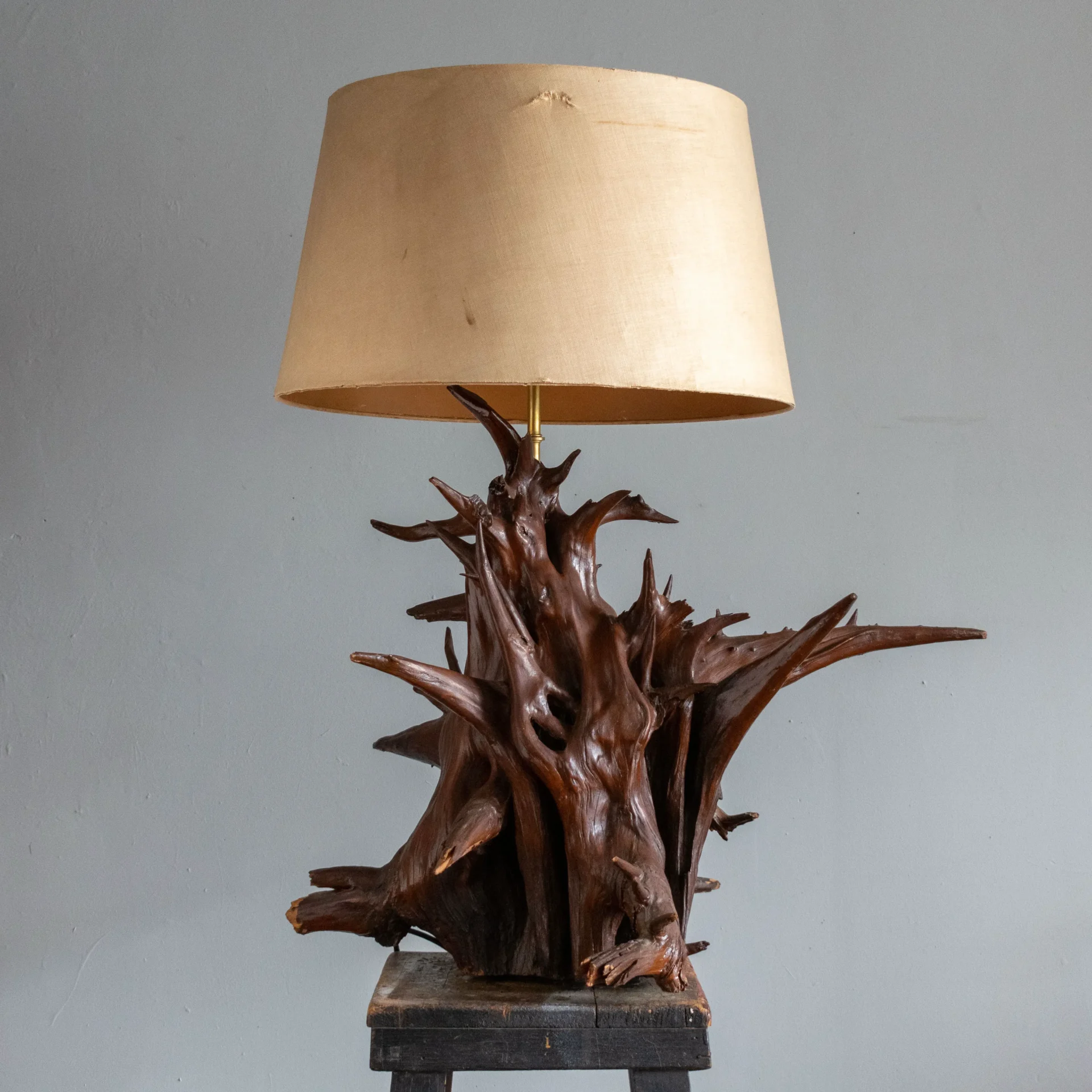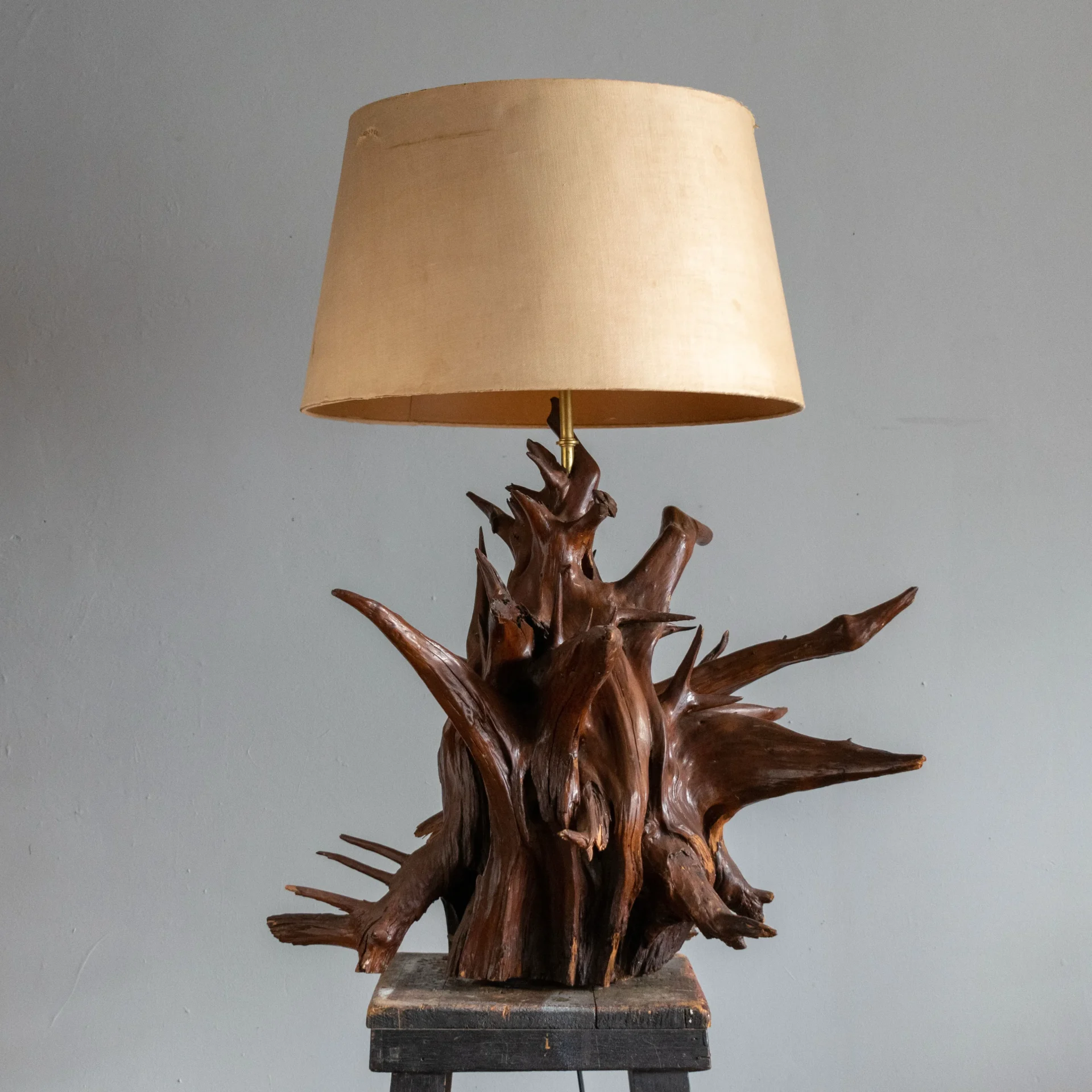 Vintage mid-20th-century driftwood rootball lamp with an overall explosive appearance. Normally comprised of several components fastened together, one lamp maker got very lucky to have found a single piece with so much sculptural integrity that not a single element needed to be added.