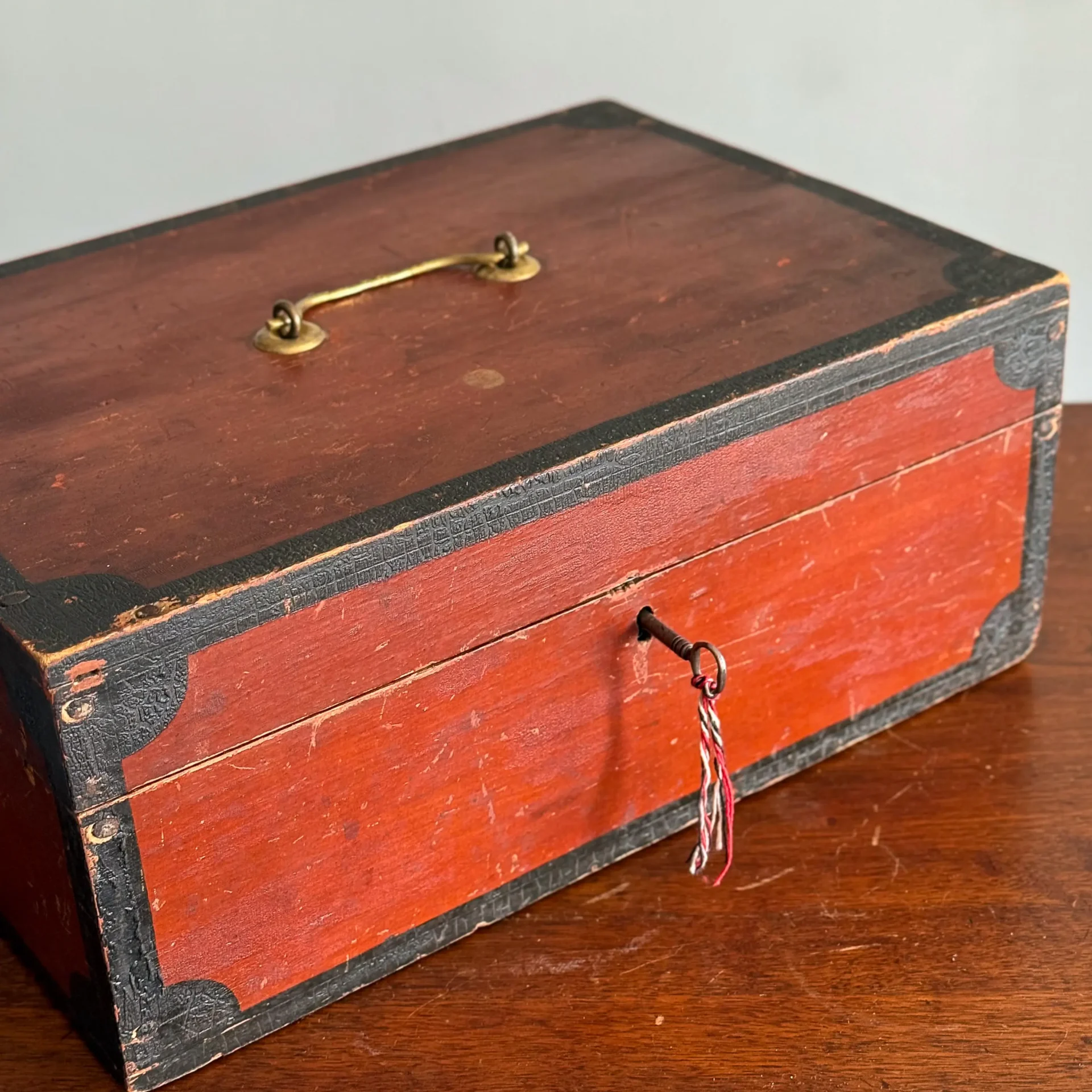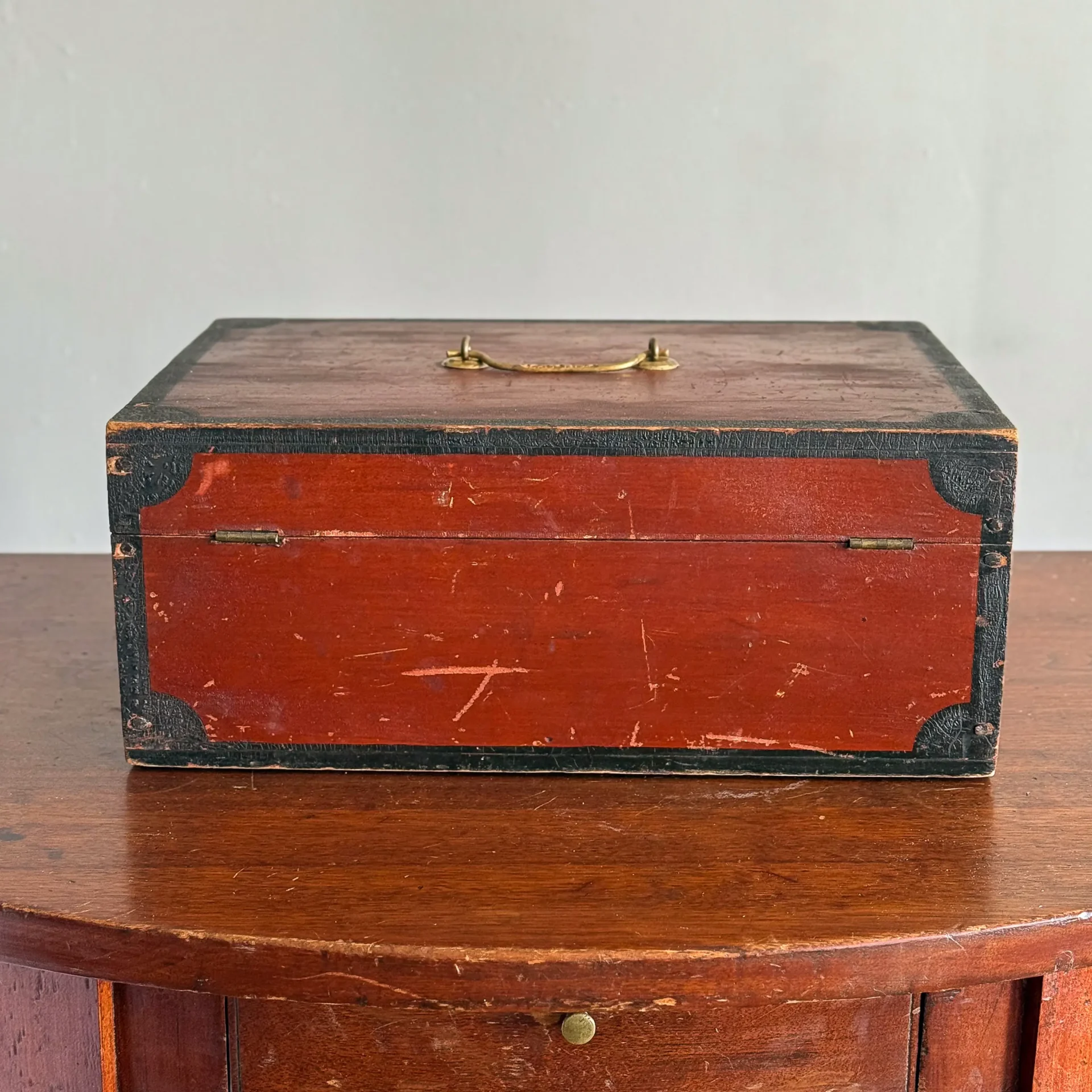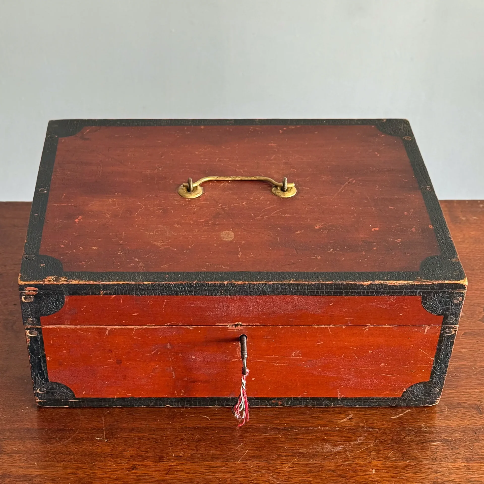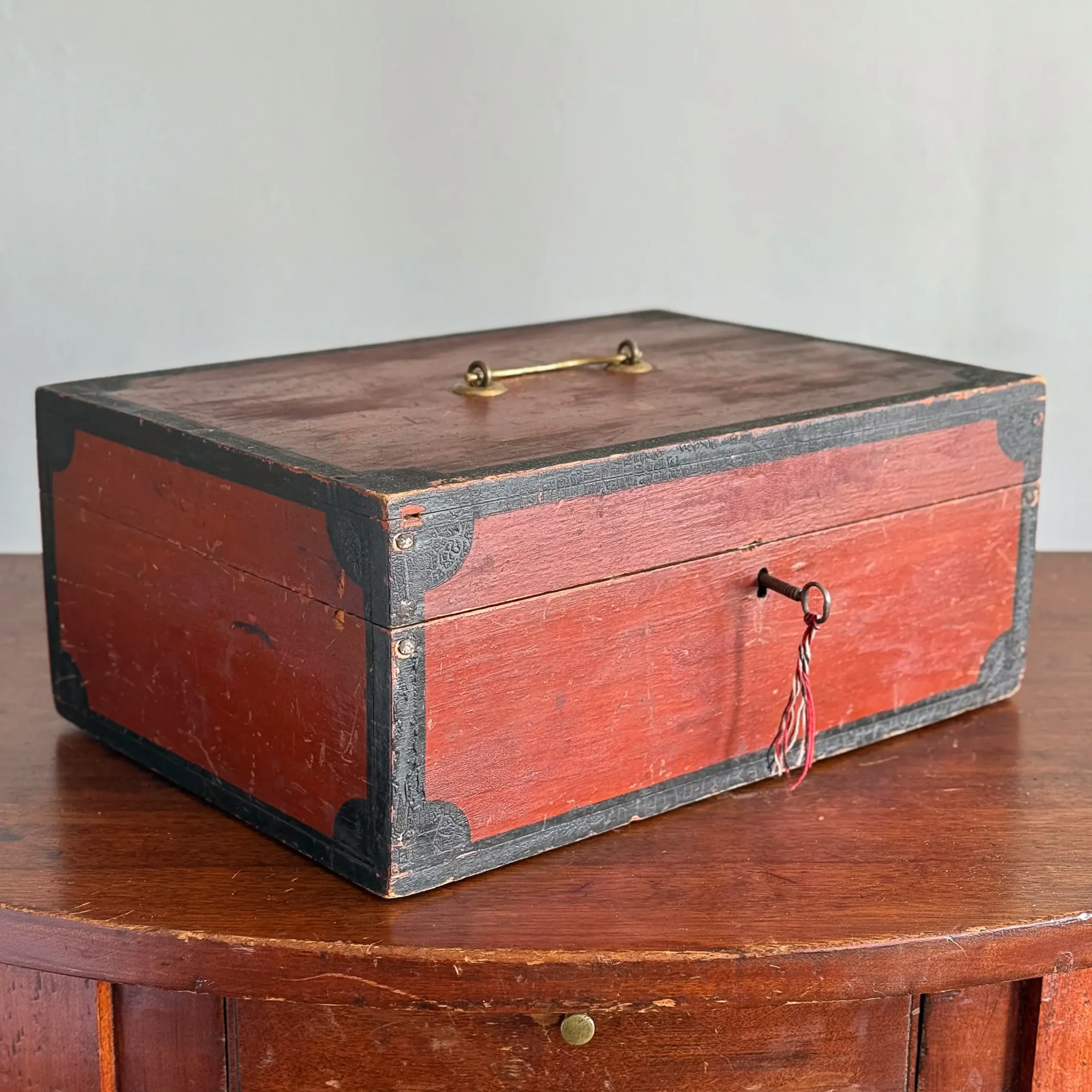 A handsome early- to mid-19th-century document box, painted entirely in carmine and framed in black with small corner lunettes. It retains its working lock and key and has a bale handle that appears to be an older replacement.