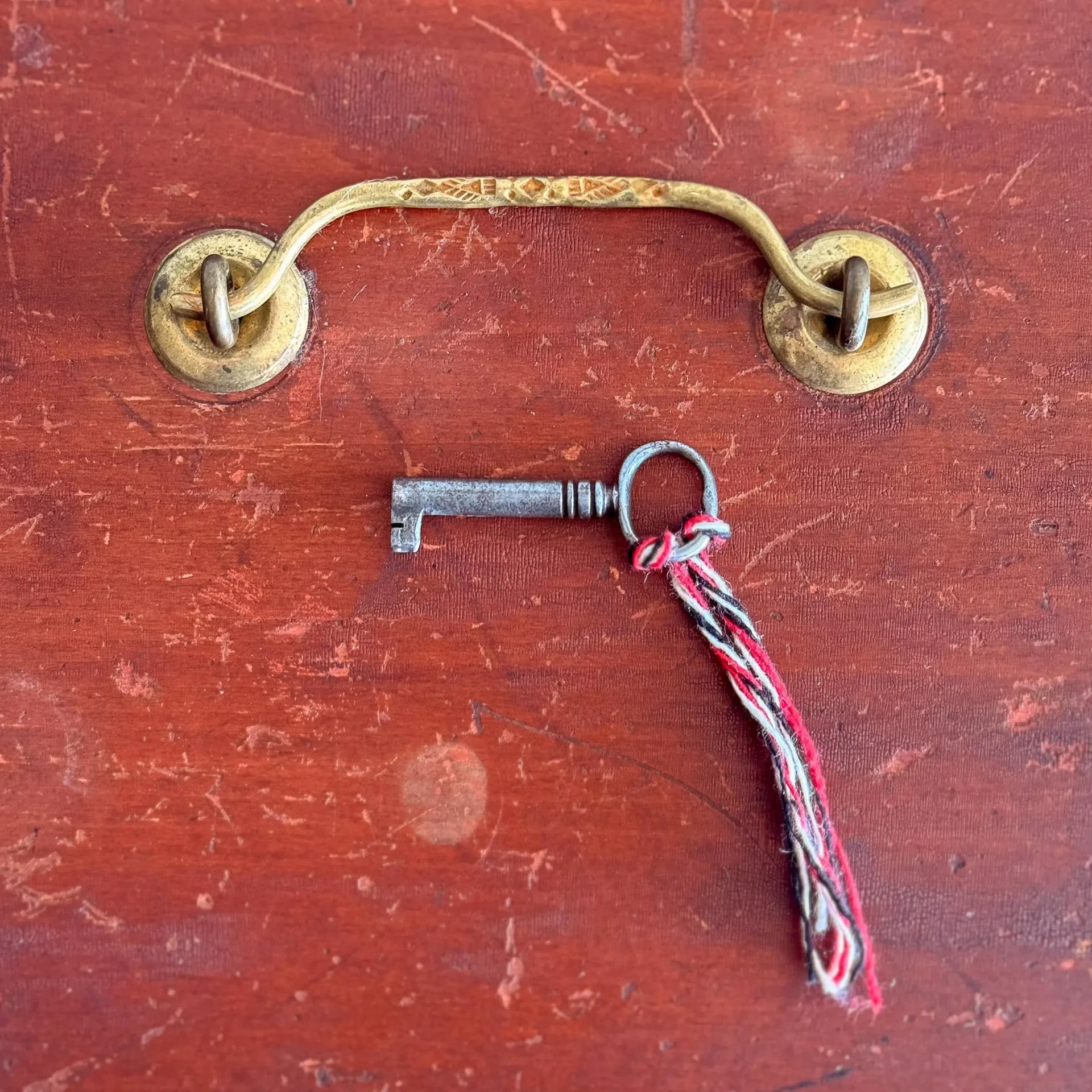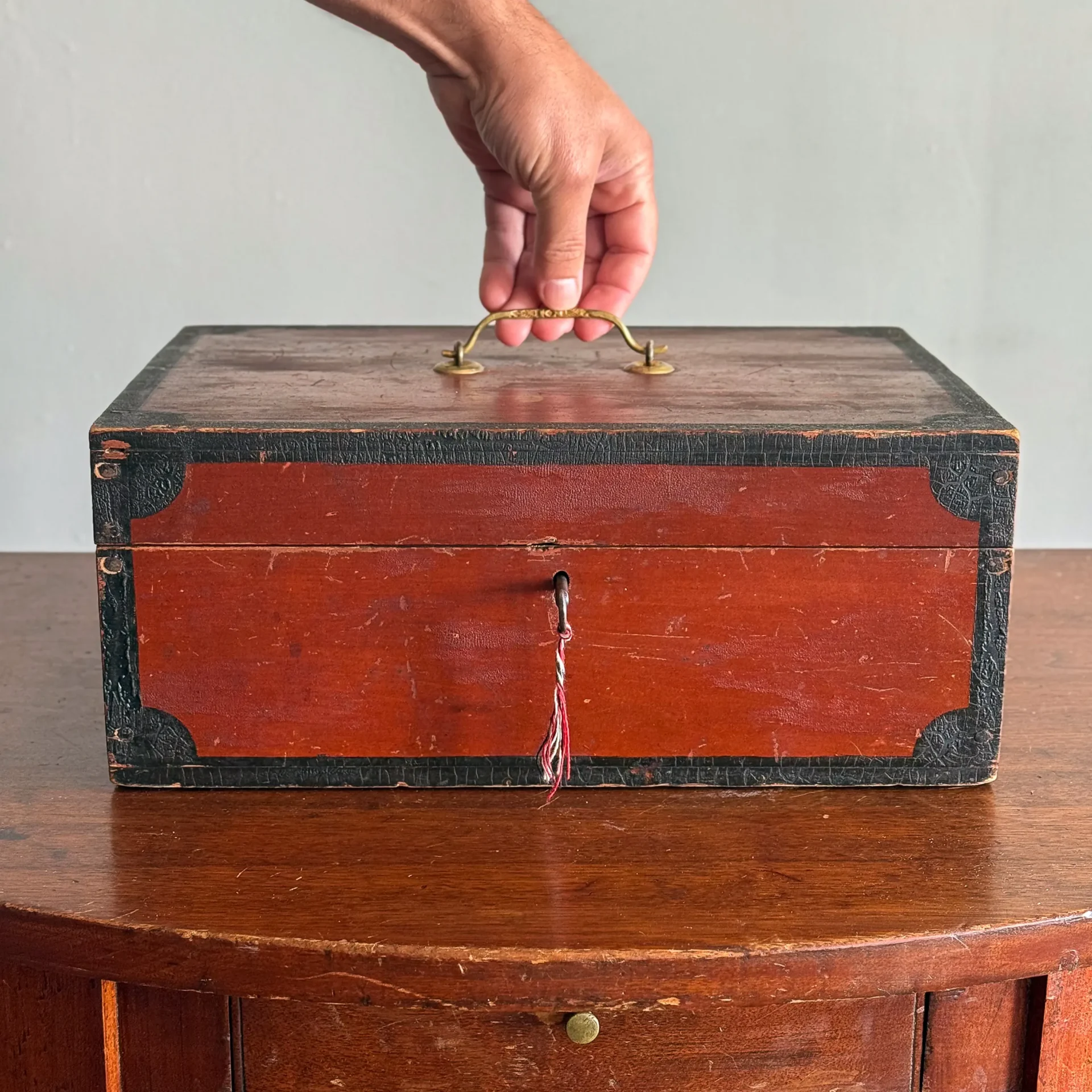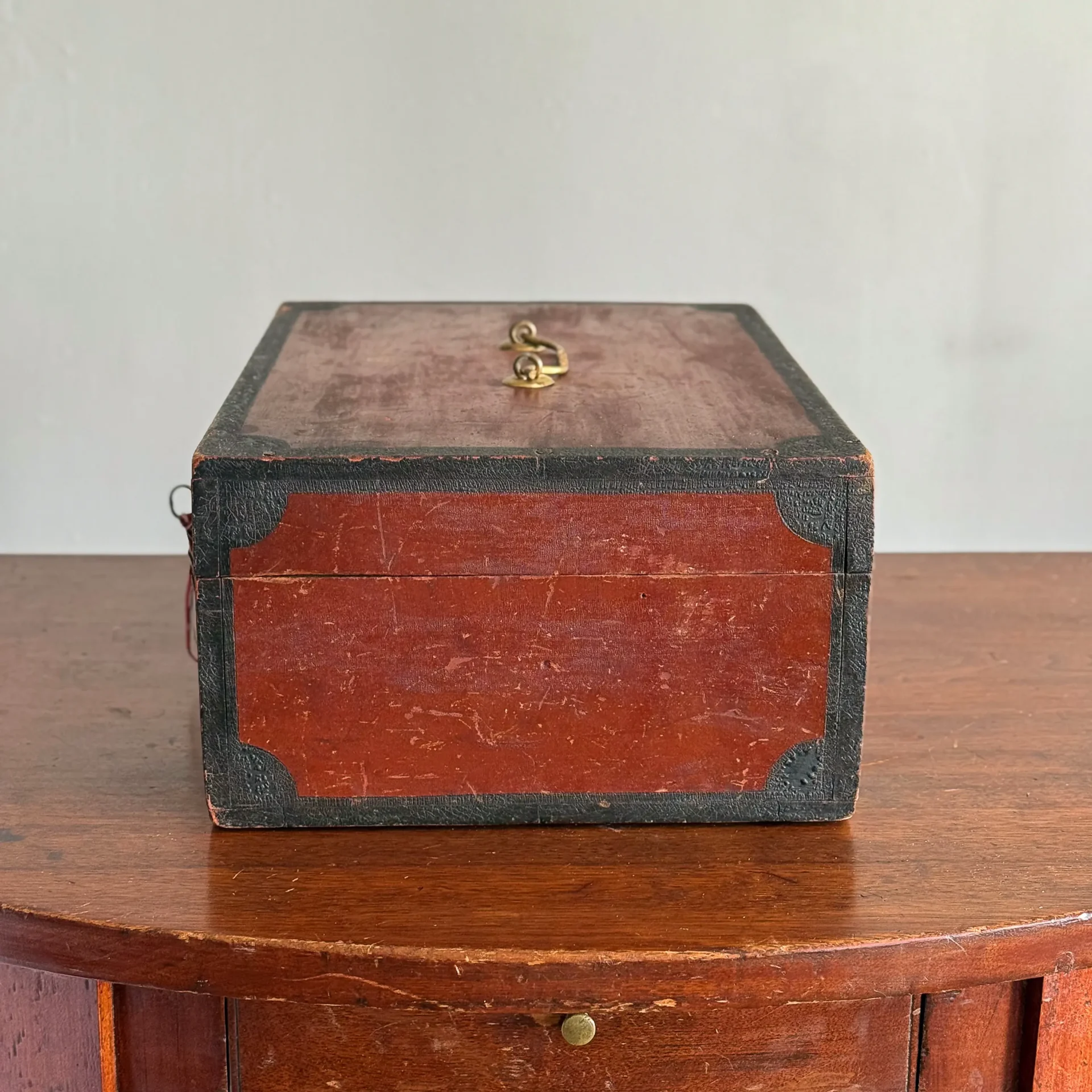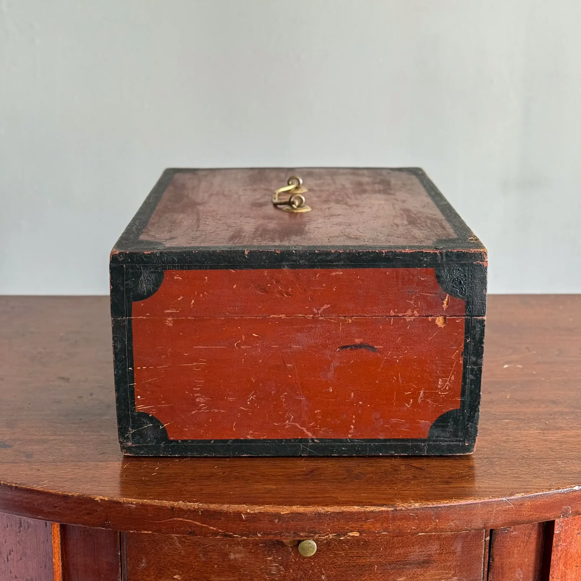 A handsome early- to mid-19th-century document box, painted entirely in carmine and framed in black with small corner lunettes. It retains its working lock and key and has a bale handle that appears to be an older replacement.