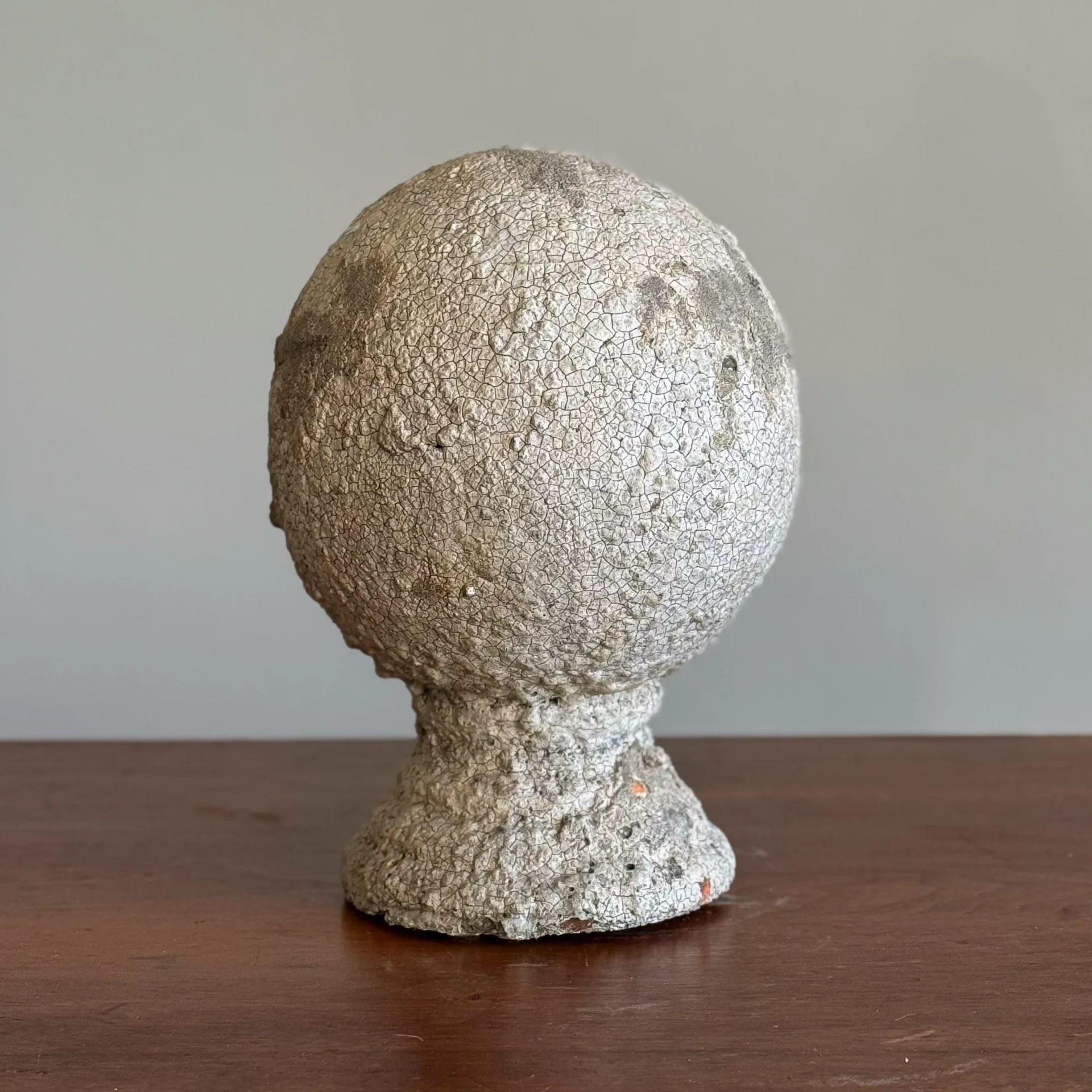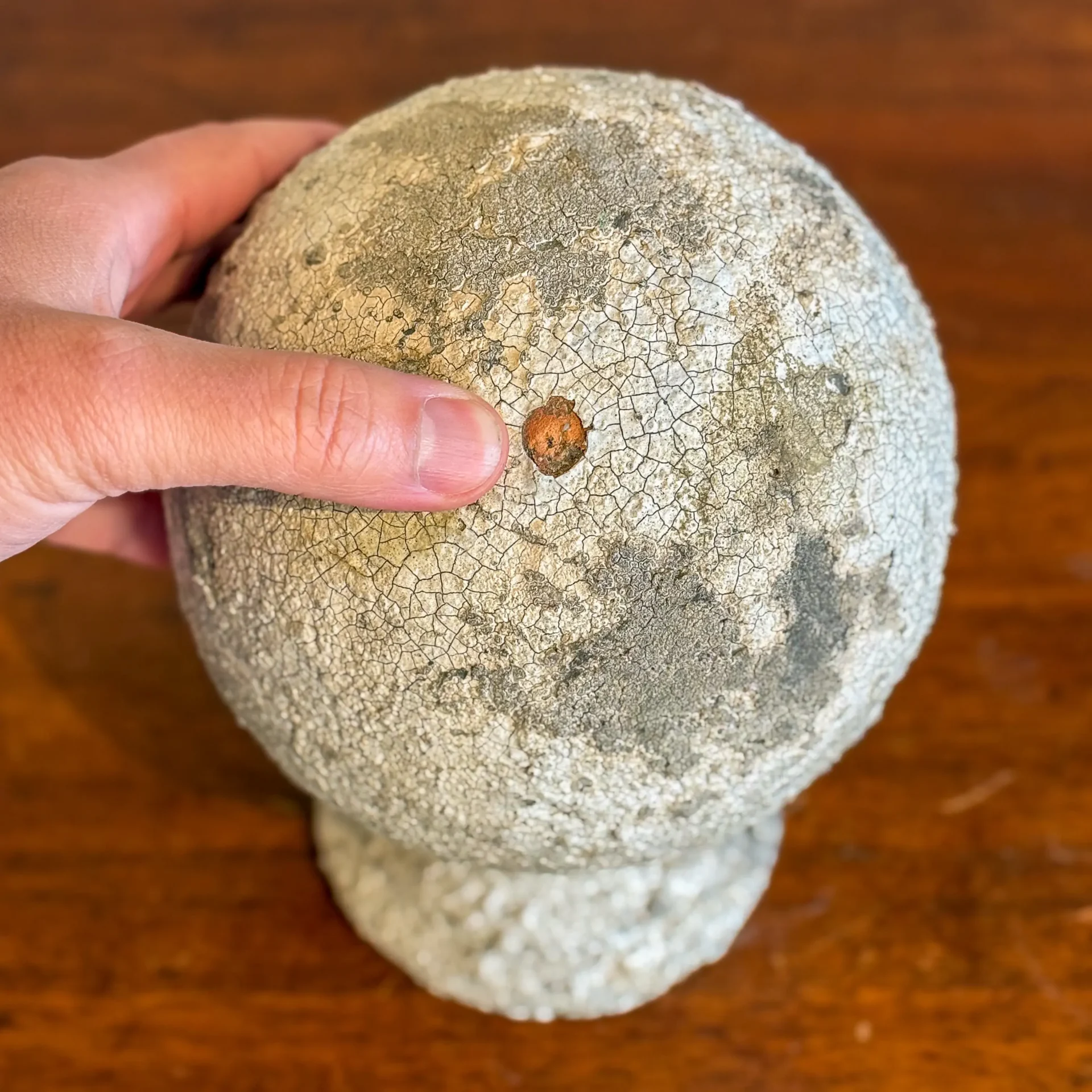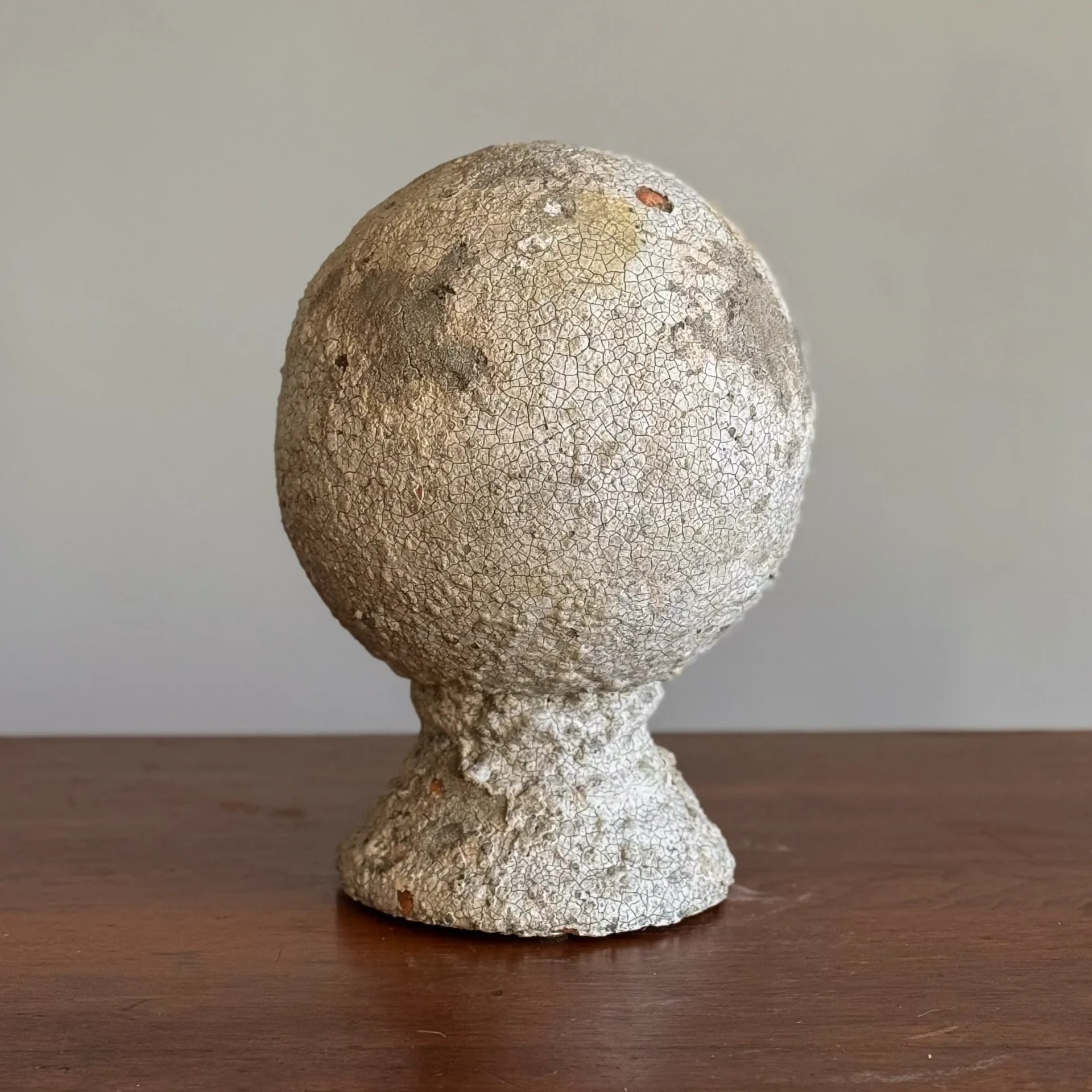 A spherical terracotta finial so thickly layered with old paint that its surface now resembles the surface of the moon. The accumulation has created a crusted, almost geological texture—evidence of long exposure and many coats of protection and neglect. A quietly sculptural form, beautiful in its accidental transformation.