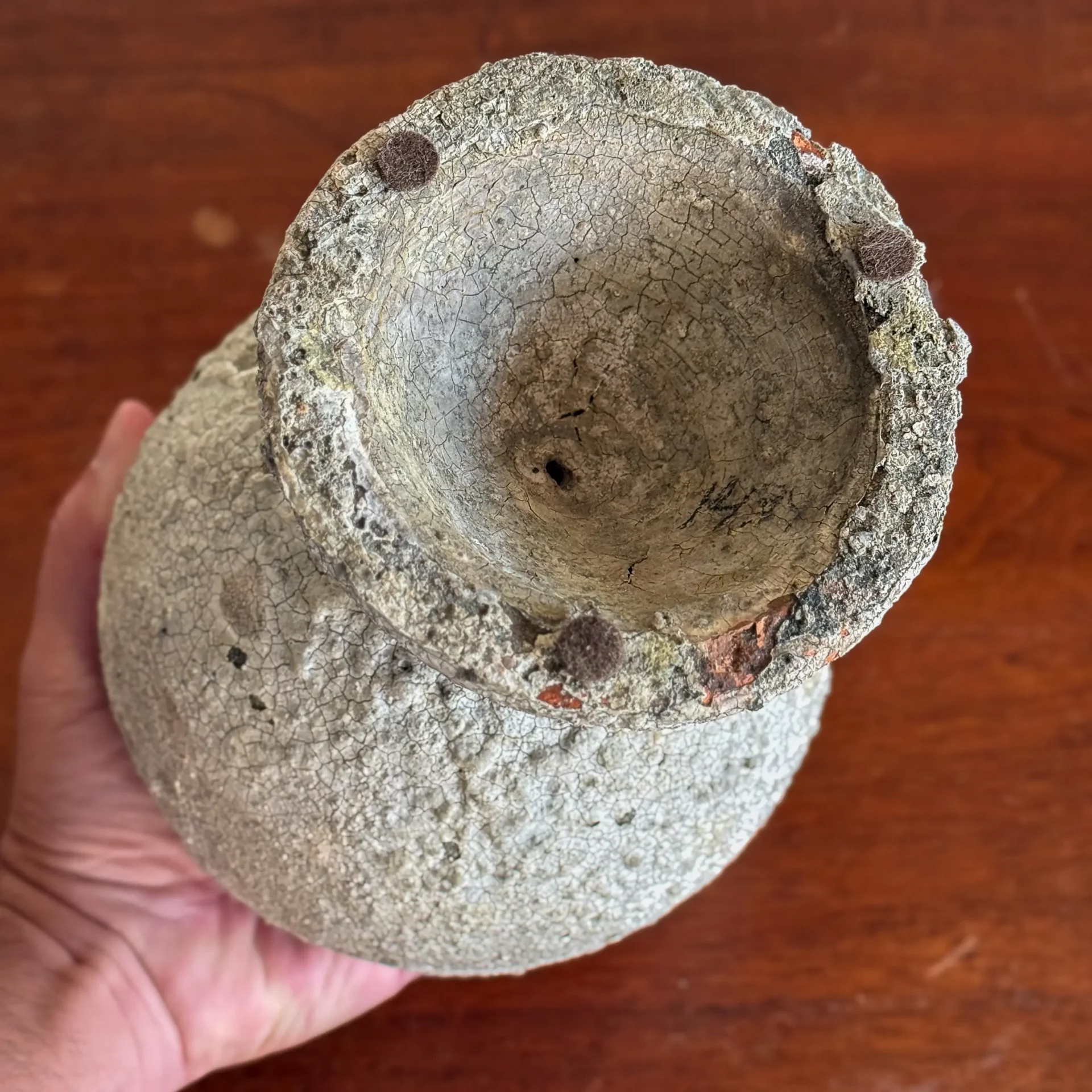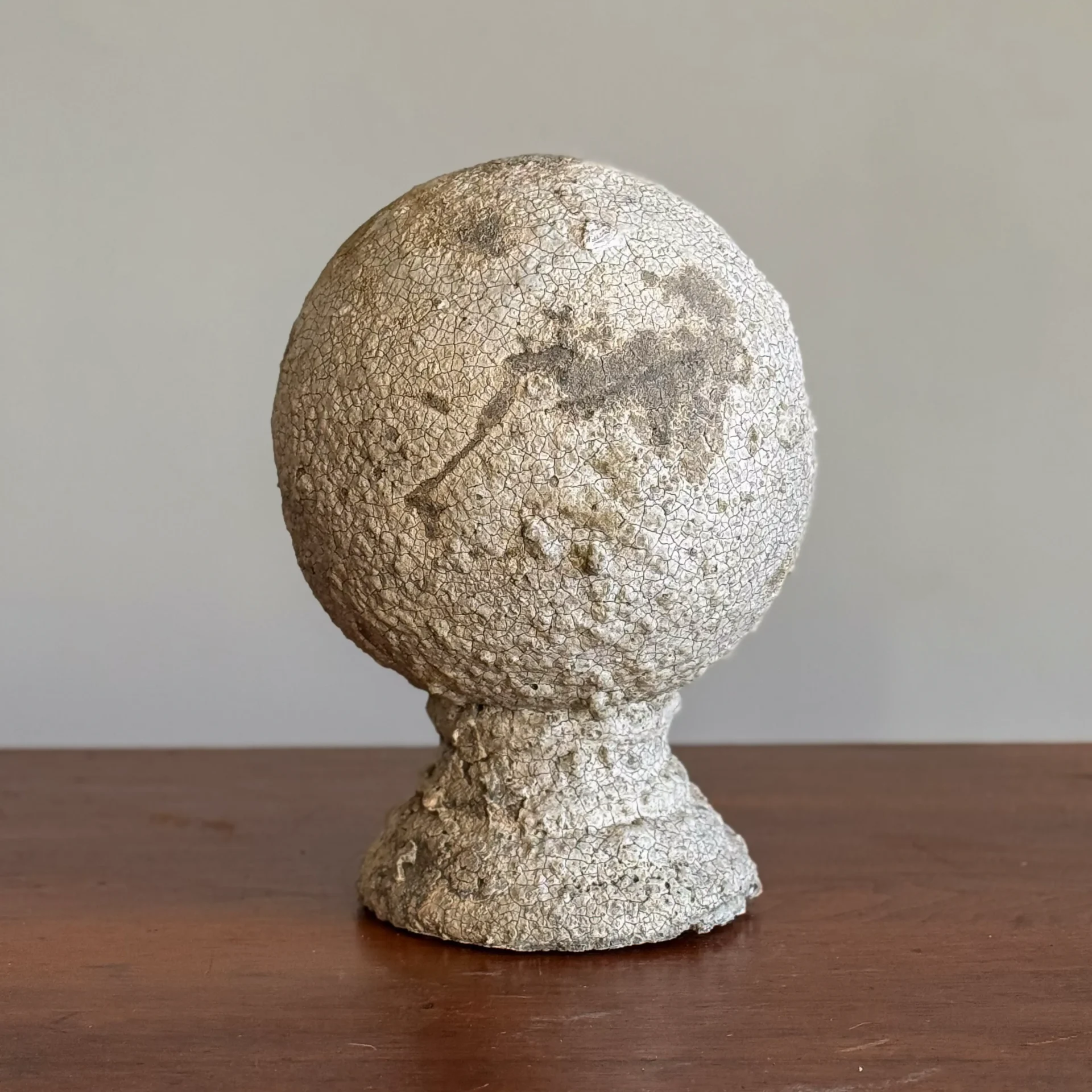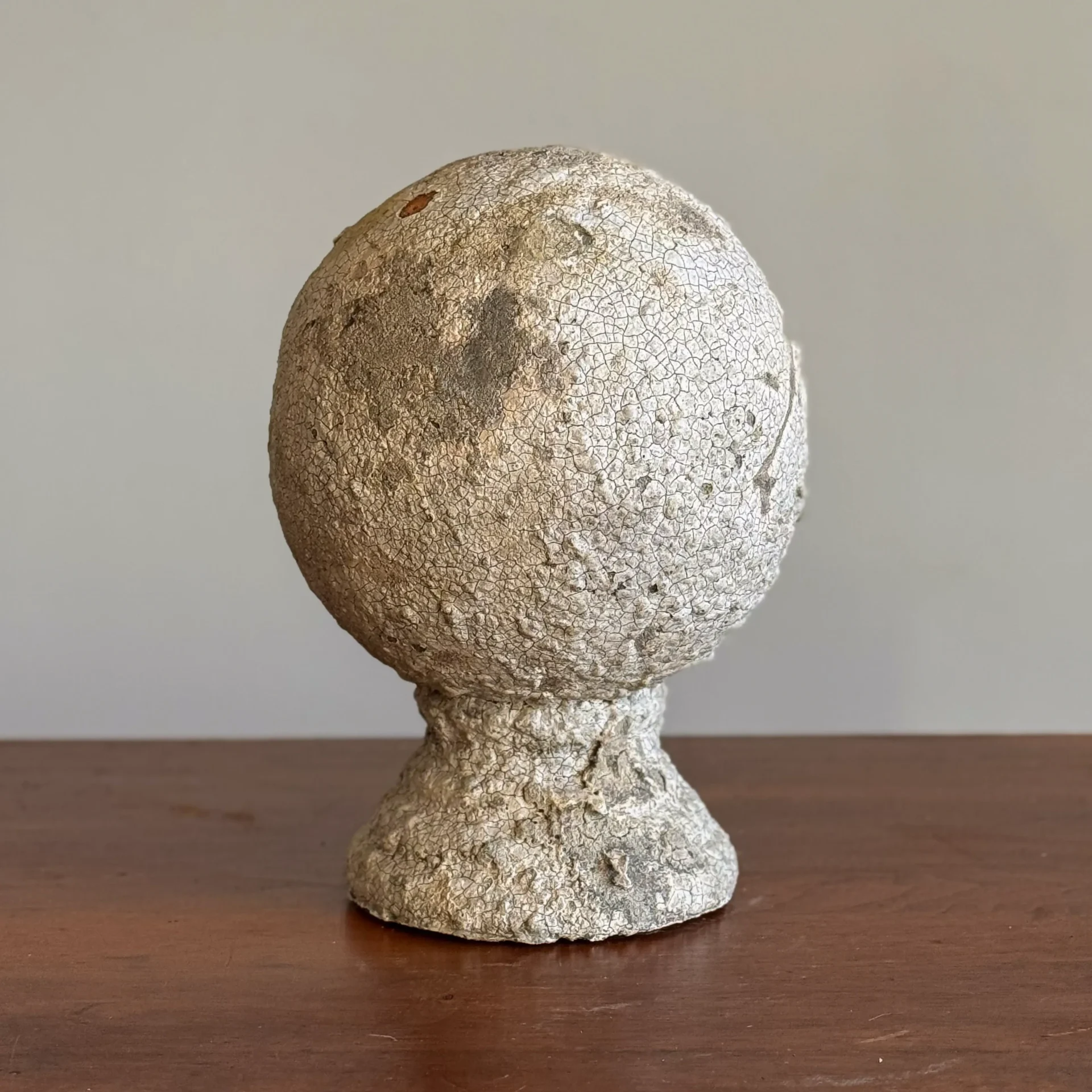 A spherical terracotta finial so thickly layered with old paint that its surface now resembles the surface of the moon. The accumulation has created a crusted, almost geological texture—evidence of long exposure and many coats of protection and neglect. A quietly sculptural form, beautiful in its accidental transformation.