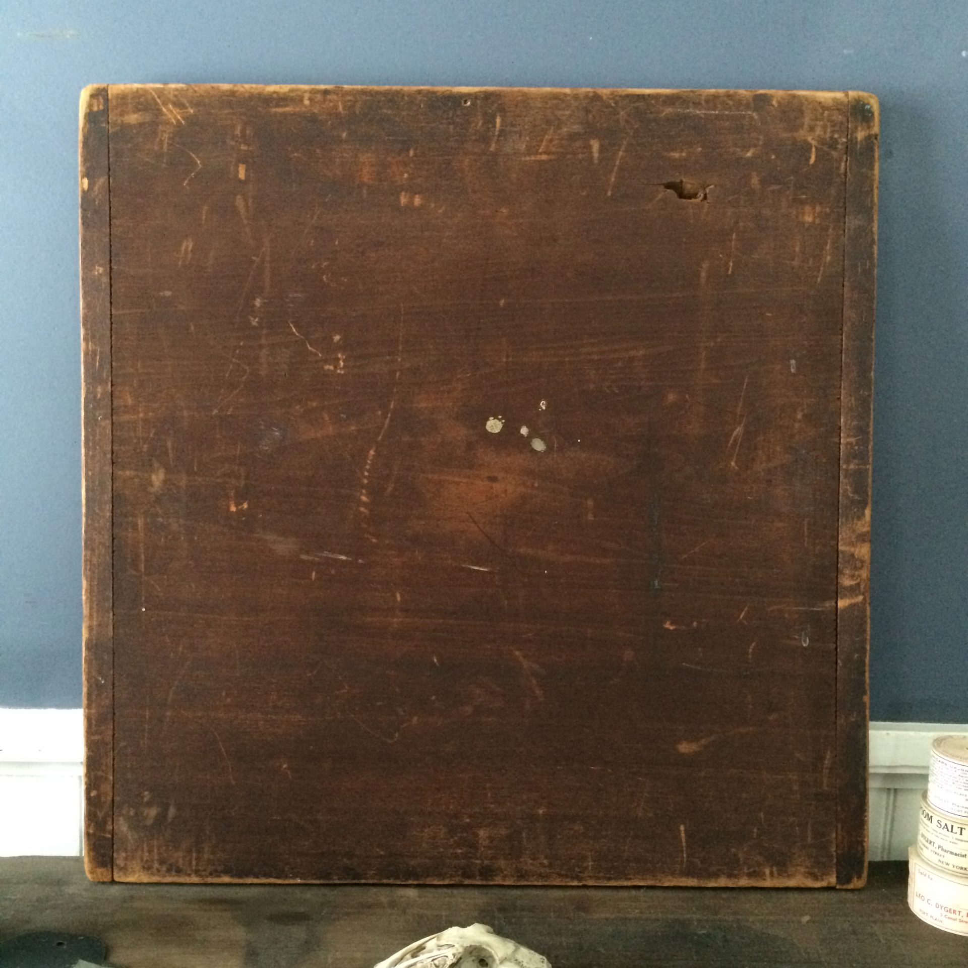 Bilious color palette of eight colors with alligatored varnished surface and heavily oxidized reverse. Constructed of a single board with breadboard ends attached with square nails.