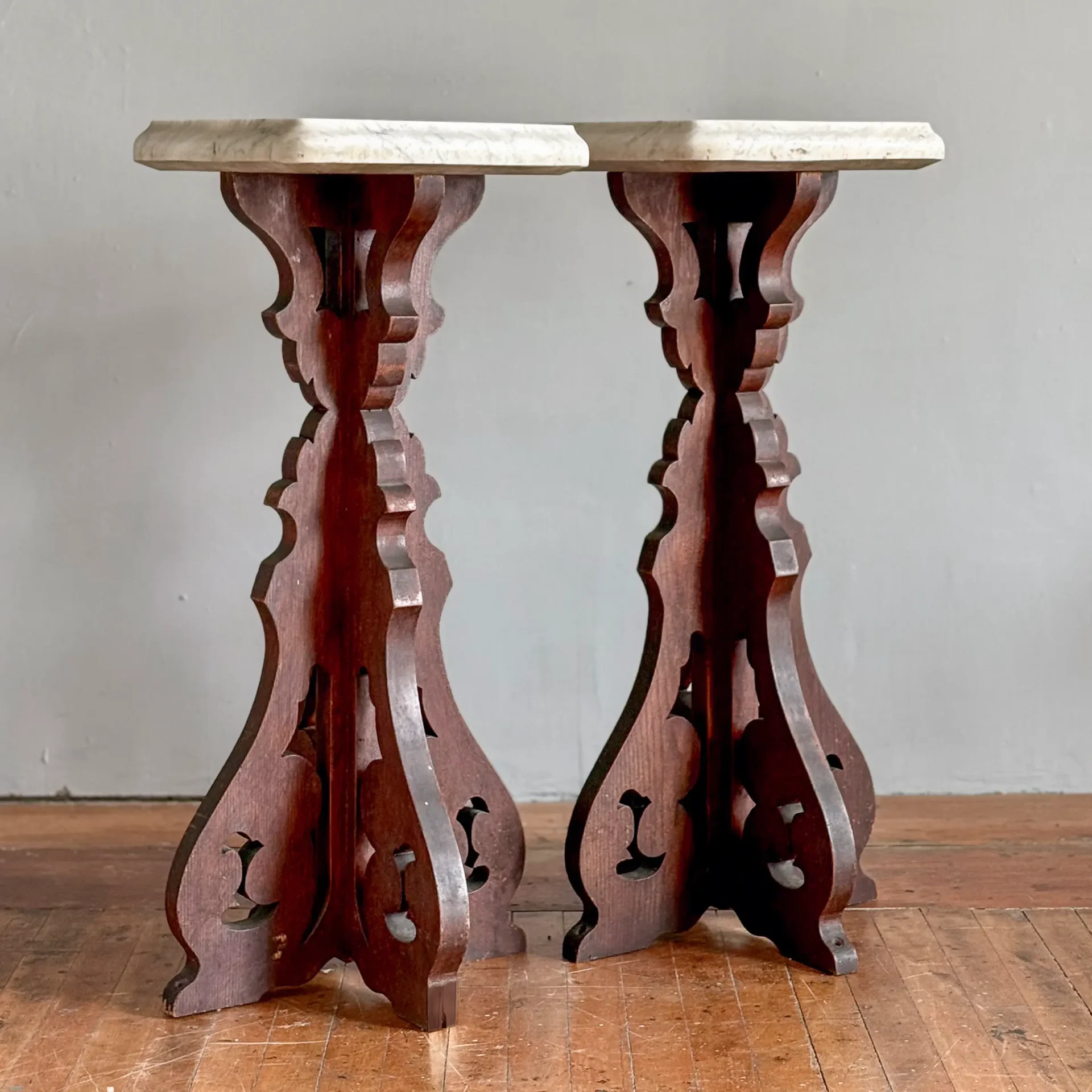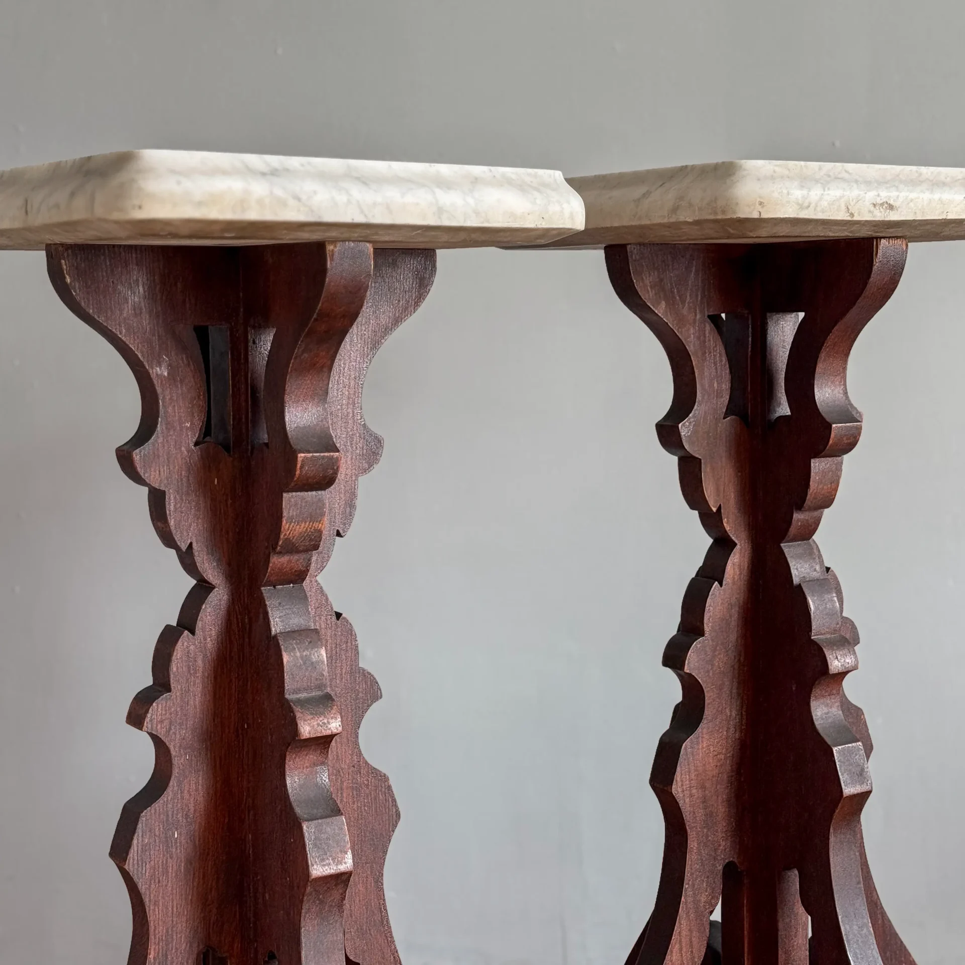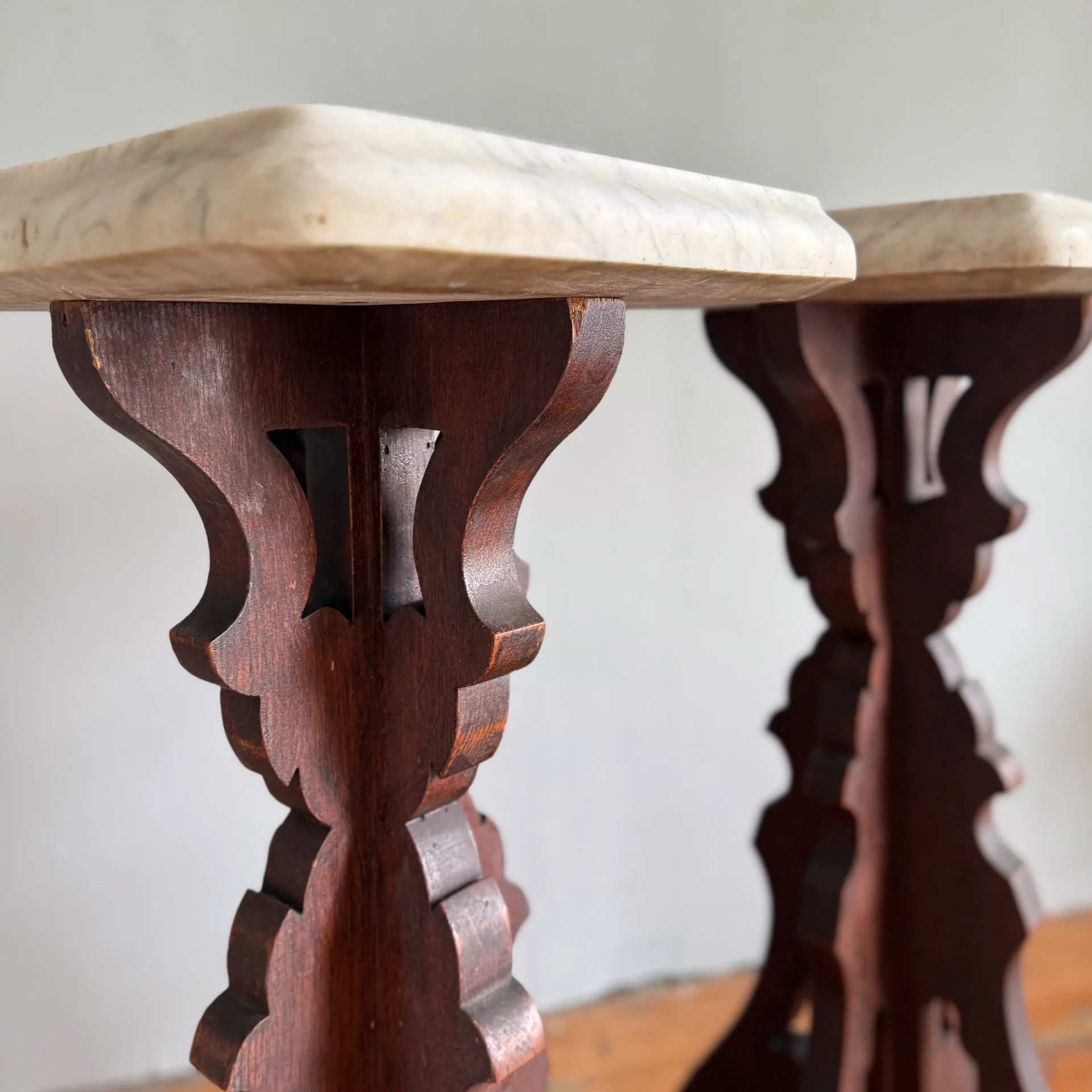 Pair of late 19th-century walnut stands with scroll-cut bases and original 2-inch-thick marble tops, shaped along their edges.