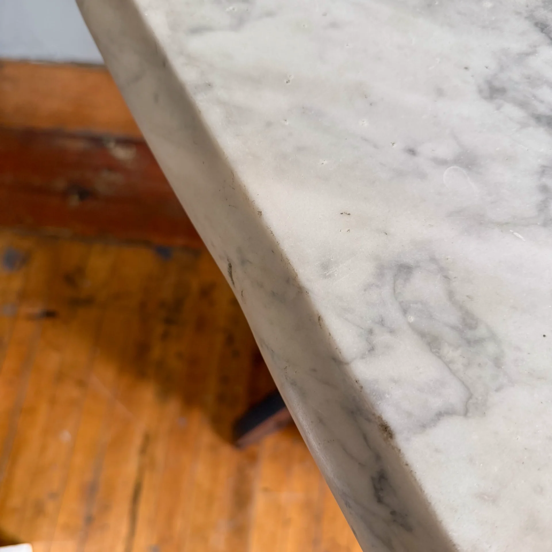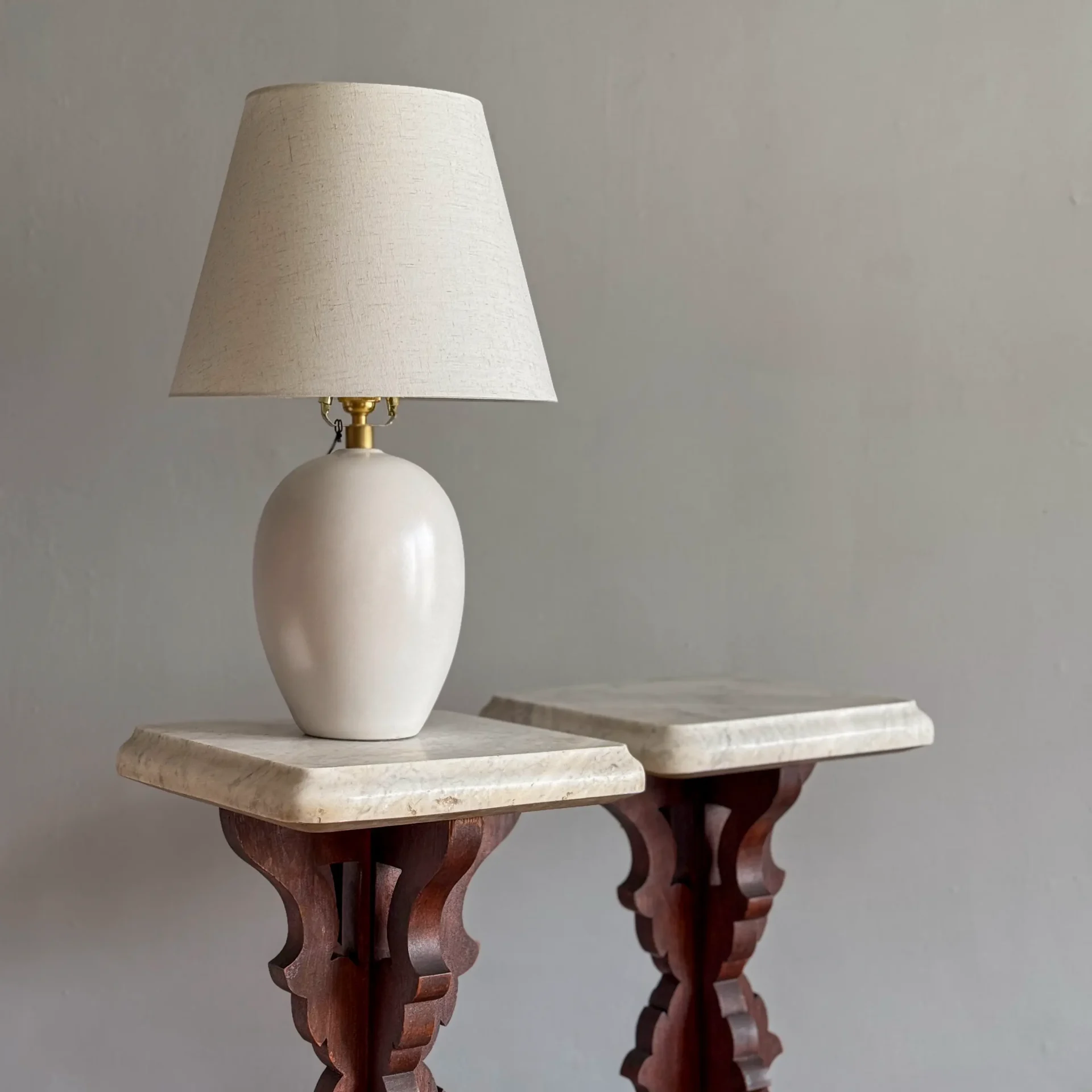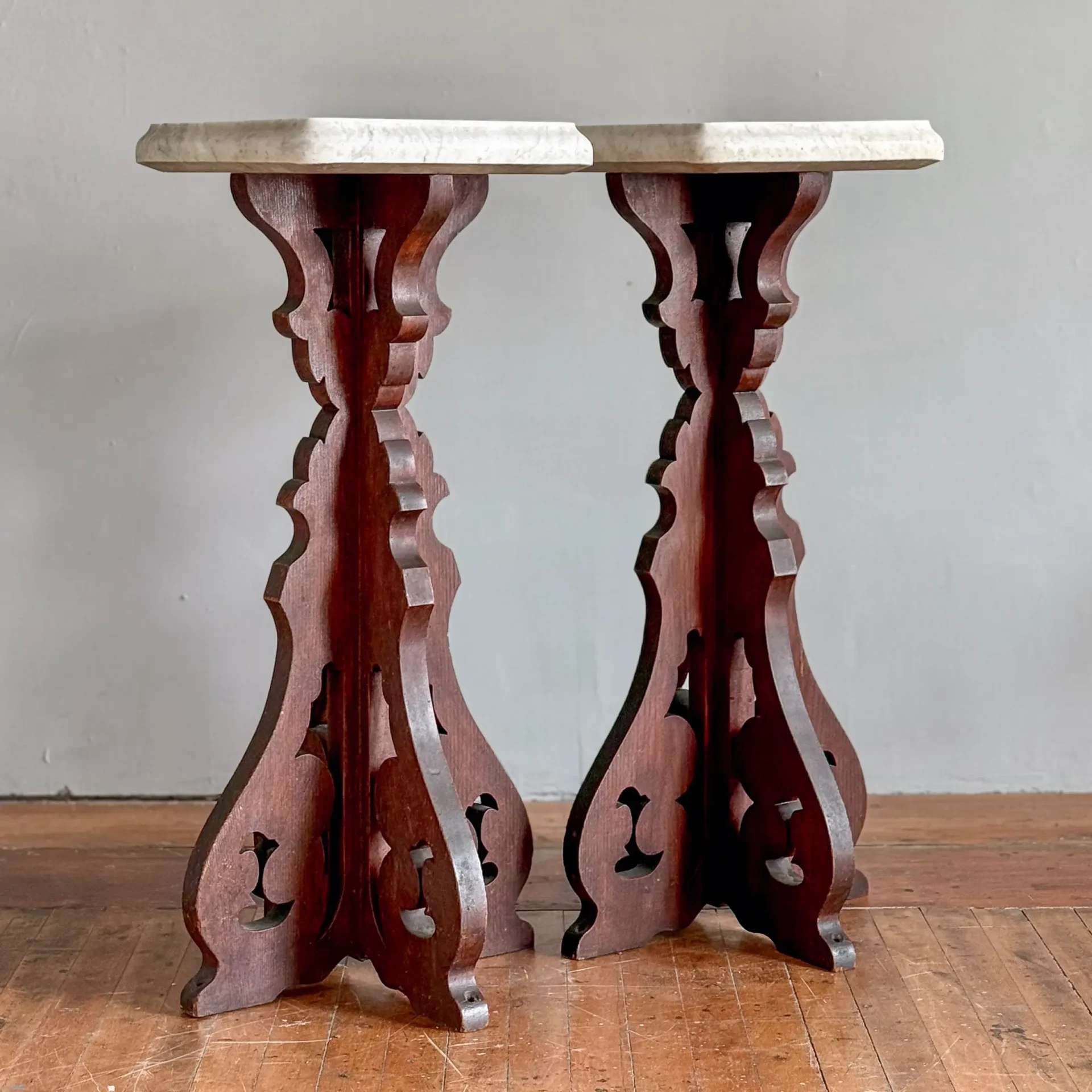 Pair of late 19th-century walnut stands with scroll-cut bases and original 2-inch-thick marble tops, shaped along their edges.