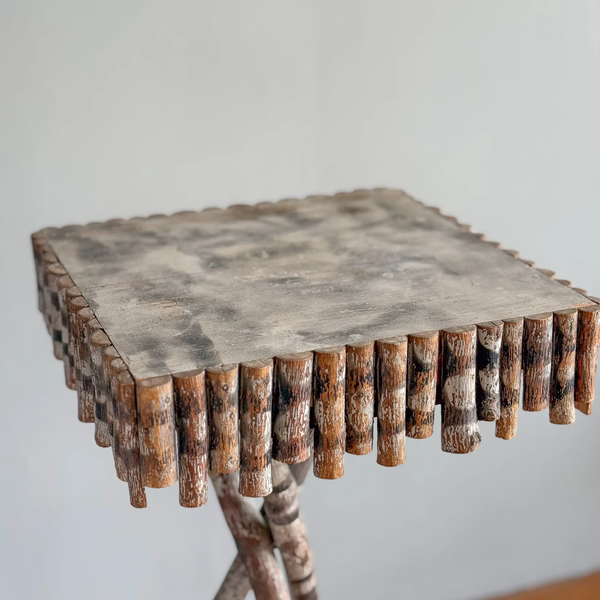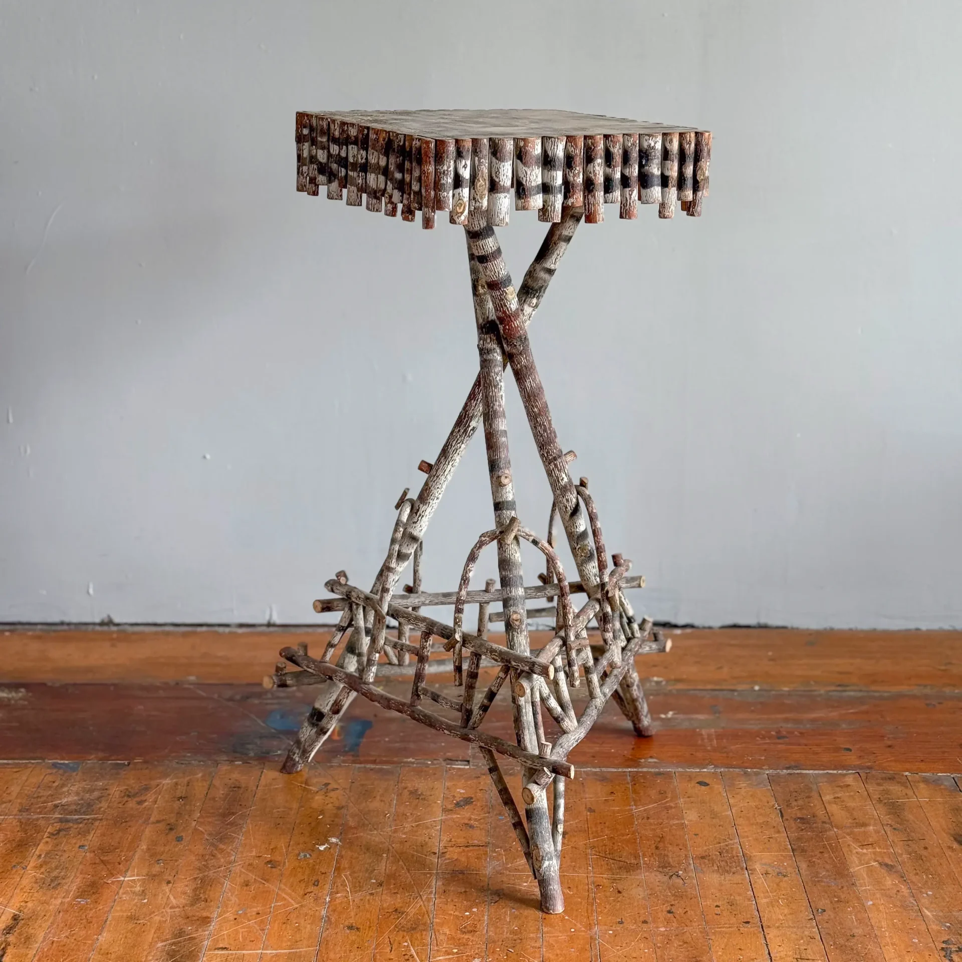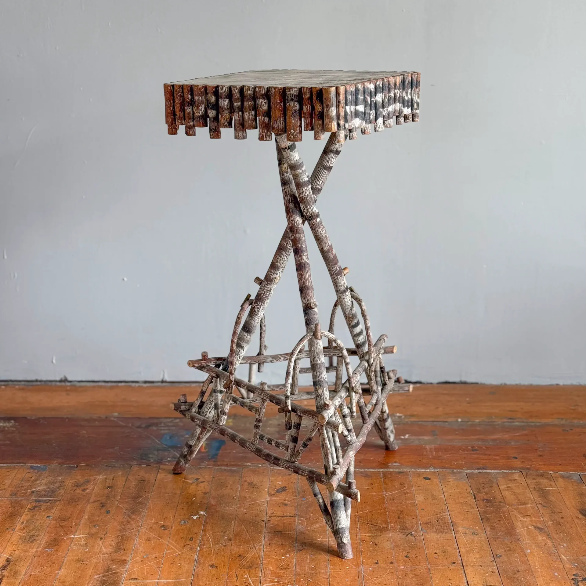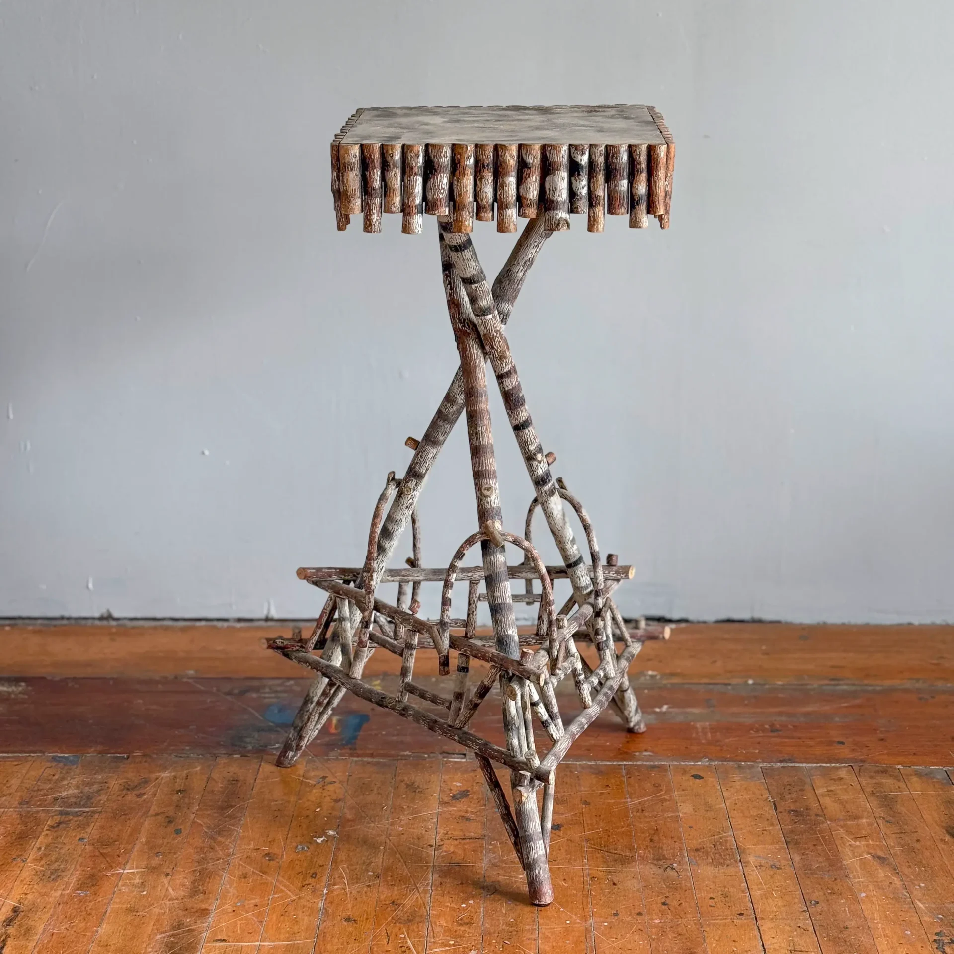 Antique striped smoke-painted willow stand with square top and elaborate twig and branch embellishments.