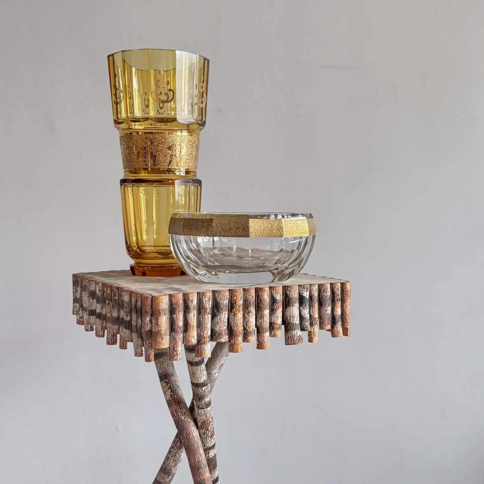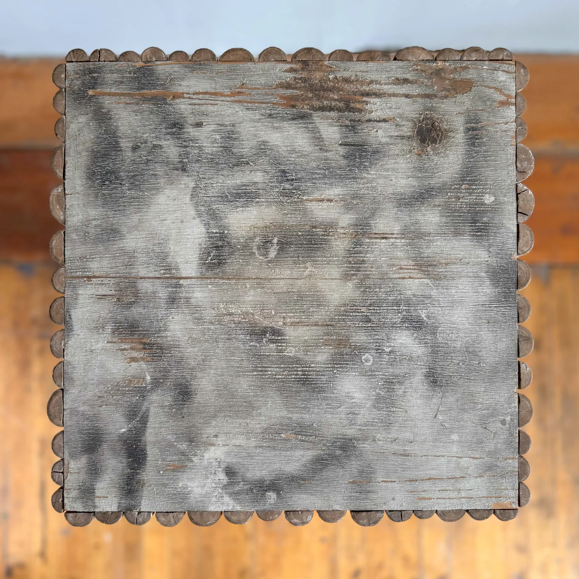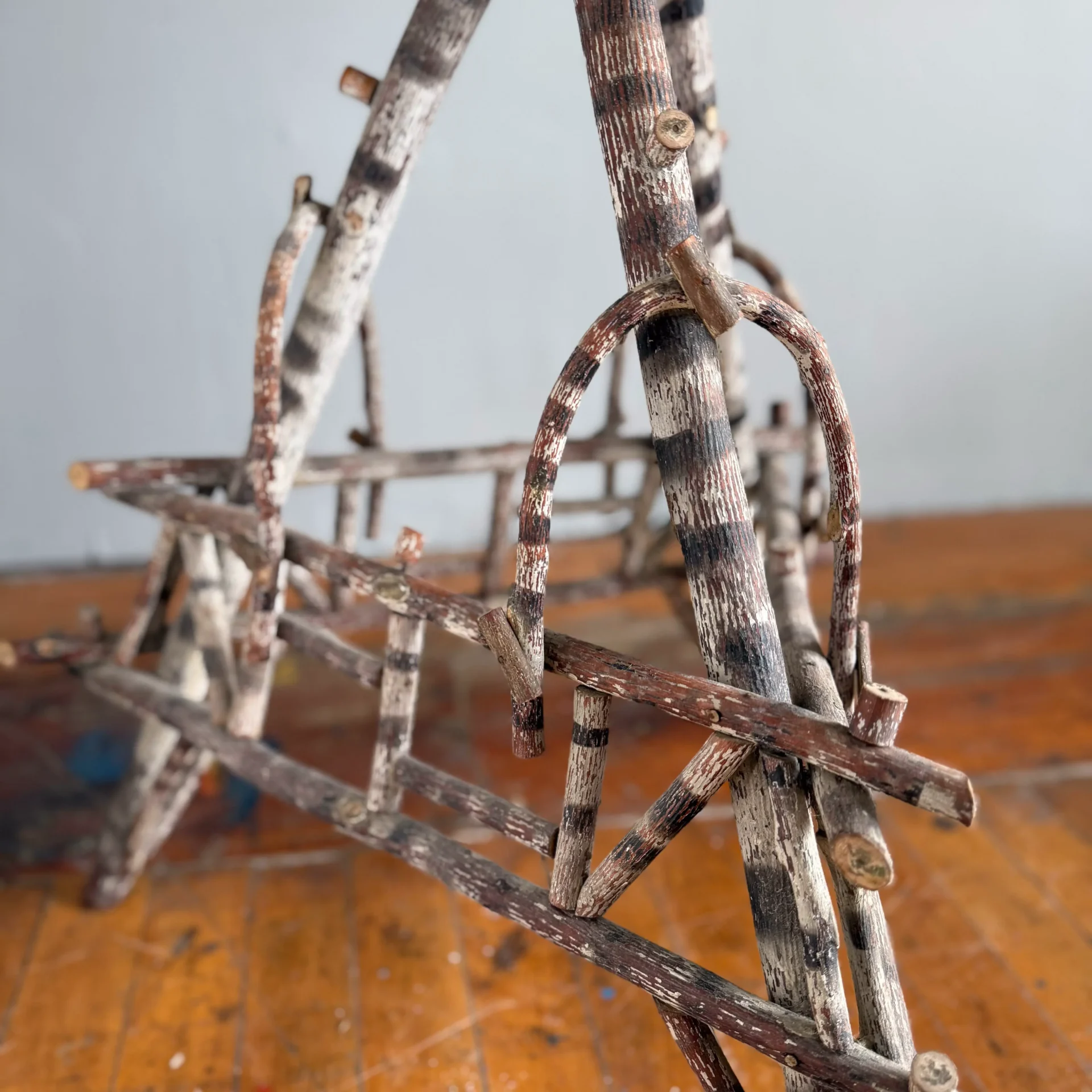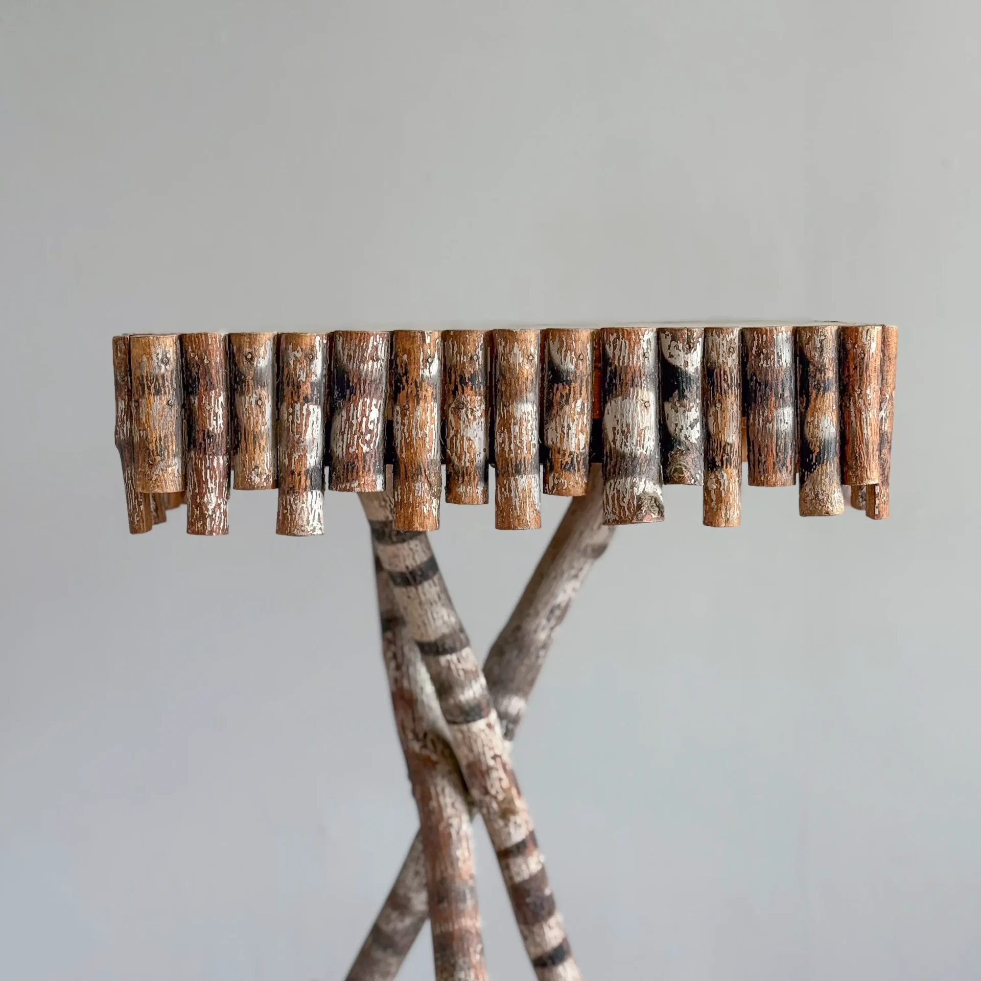 Antique striped smoke-painted willow stand with square top and elaborate twig and branch embellishments.